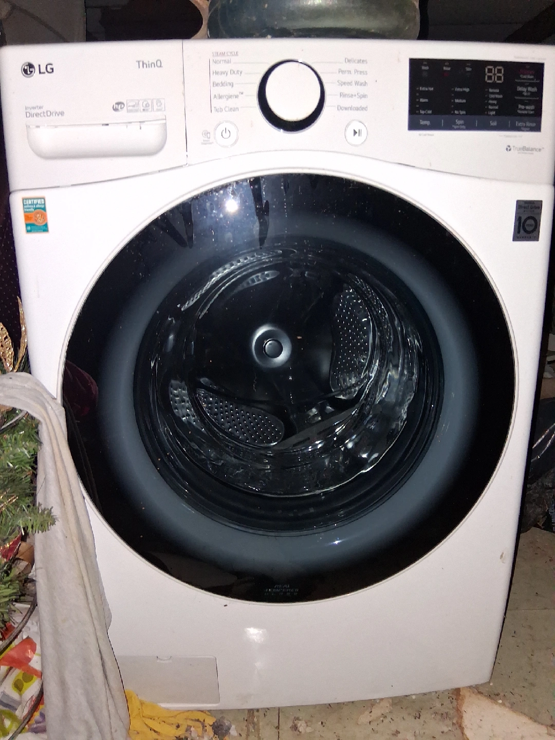 60Selling an LG ThinQ Inverter Direct Drive washing machine. It features TrueBalance technology and a 10-year warranty on the Direct Drive motor. It has multiple wash cycles including Steam, Normal, Heavy Duty, Bedding, Allergiene, and Tub Clean