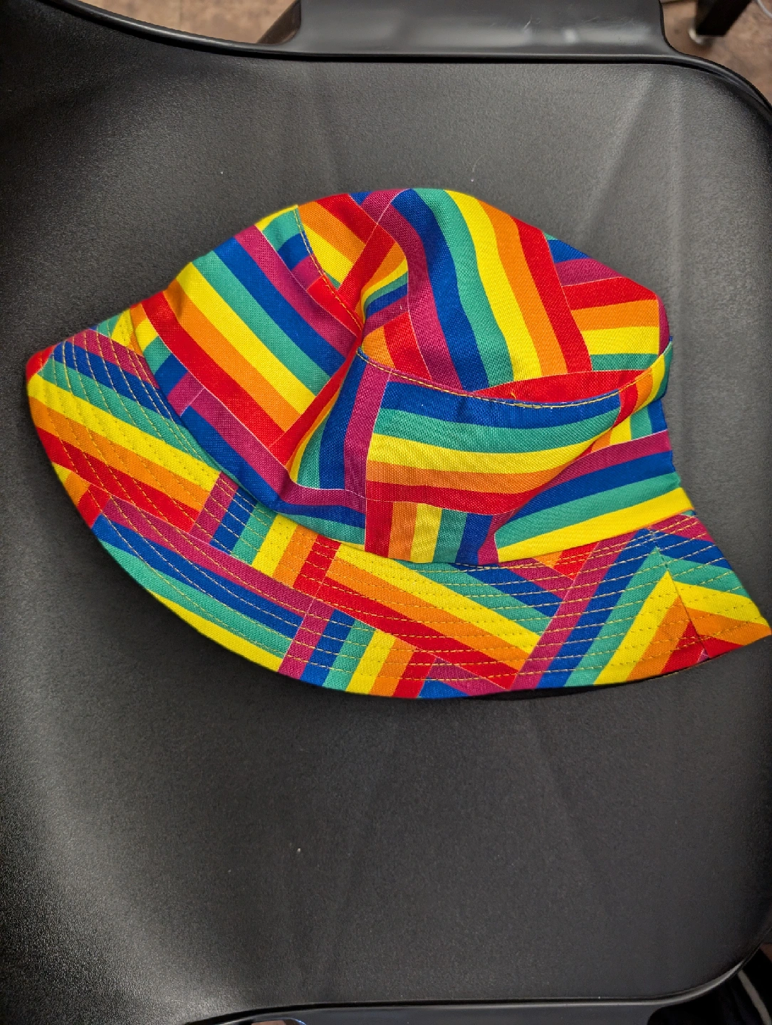 Colorful rainbow bucket hat in great condition! Perfect for adding a pop of color to any outfit. The hat is made of a comfortable material and has a black lining. This hat are not just about making a fashion statement; they're a vibrant celebration of identity and pride. Designed for the queer community, they blend functionality with fabulousness, perfect for those sunny days at the beach, pride parades, or just a casual day out. LGBTQ Bucket Hat, fun hat, quirky hat, colorful hat, preppy hat, gay romance hat, gay hat, fun hat, fun cap, colorful, colorful bucket hat
