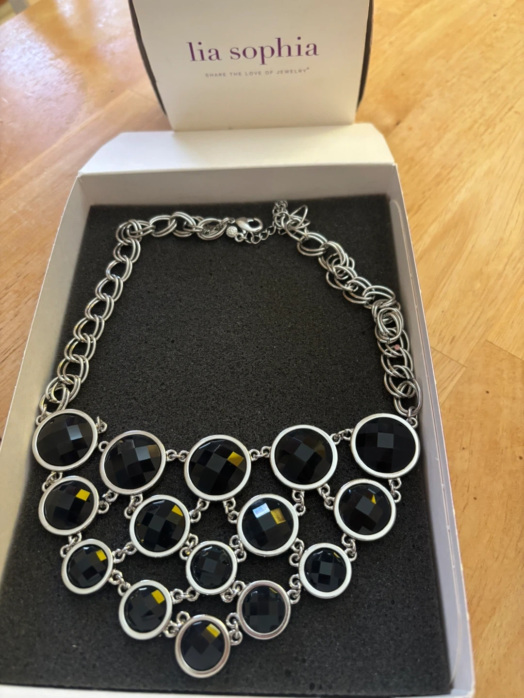 10Selling a Lia Sophia necklace featuring black stones. It comes in its original box and is in excellent condition!