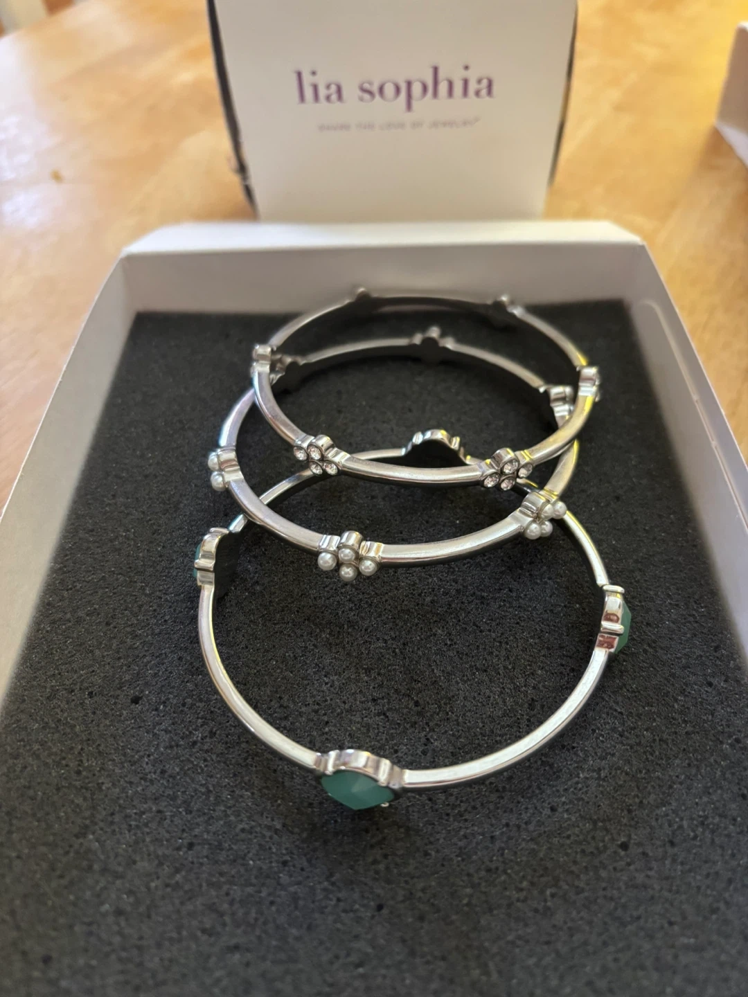 Selling a set of three Lia Sophia bangle bracelets in silver tone. They come in the original box and are in great condition! Perfect for adding a touch of sparkle to any outfit