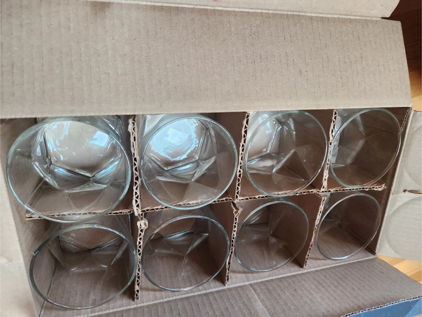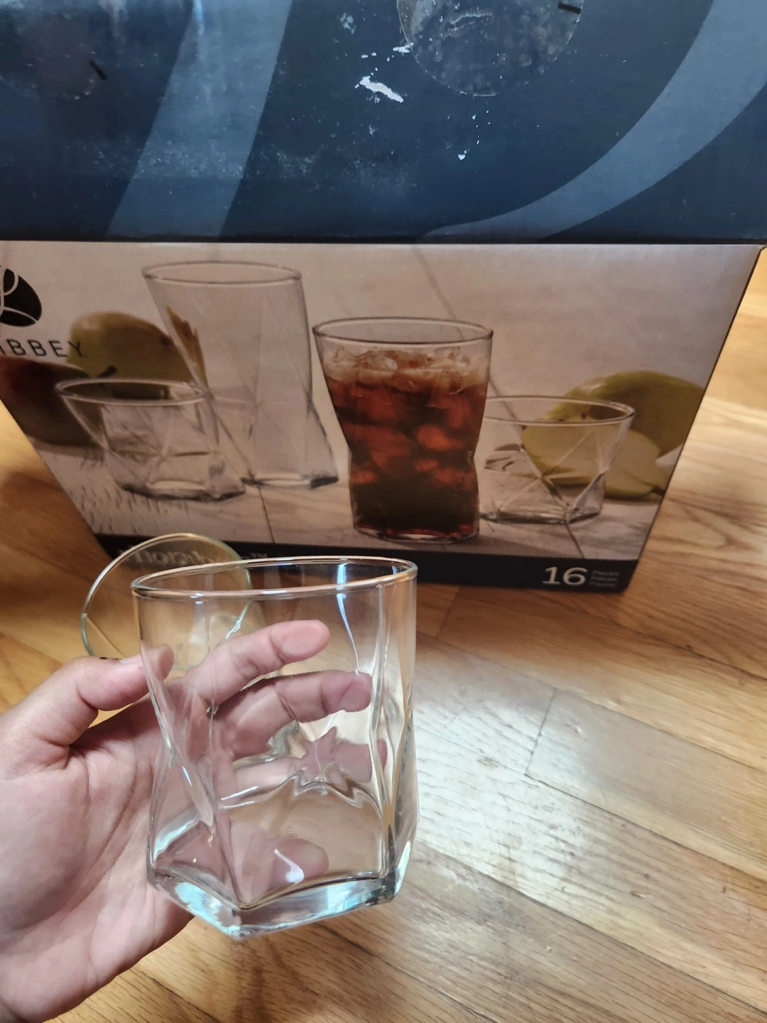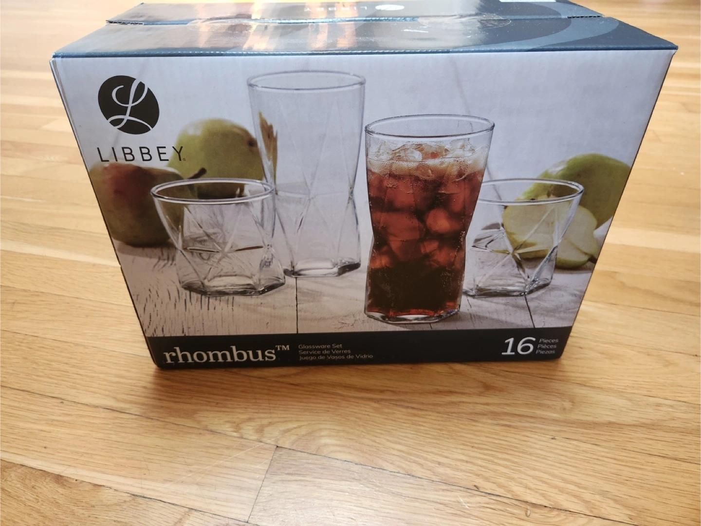 Selling a set of 16 Libbey Rhombus tumbler and rocks drinking glasses! These fun geometric glasses are perfect for cocktails, water, and everyday use. The set comes with the original box.