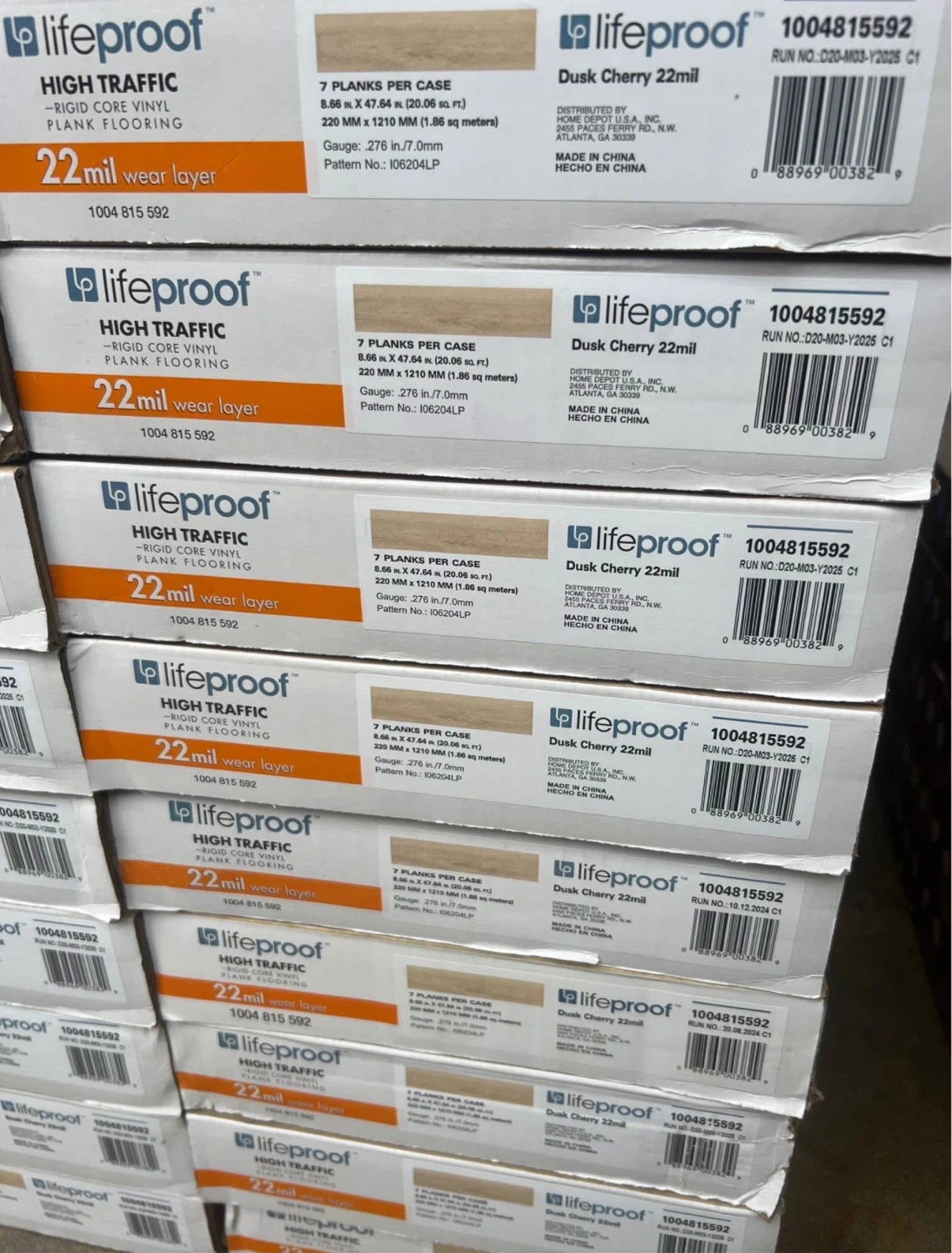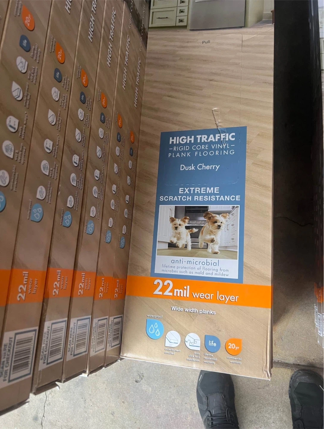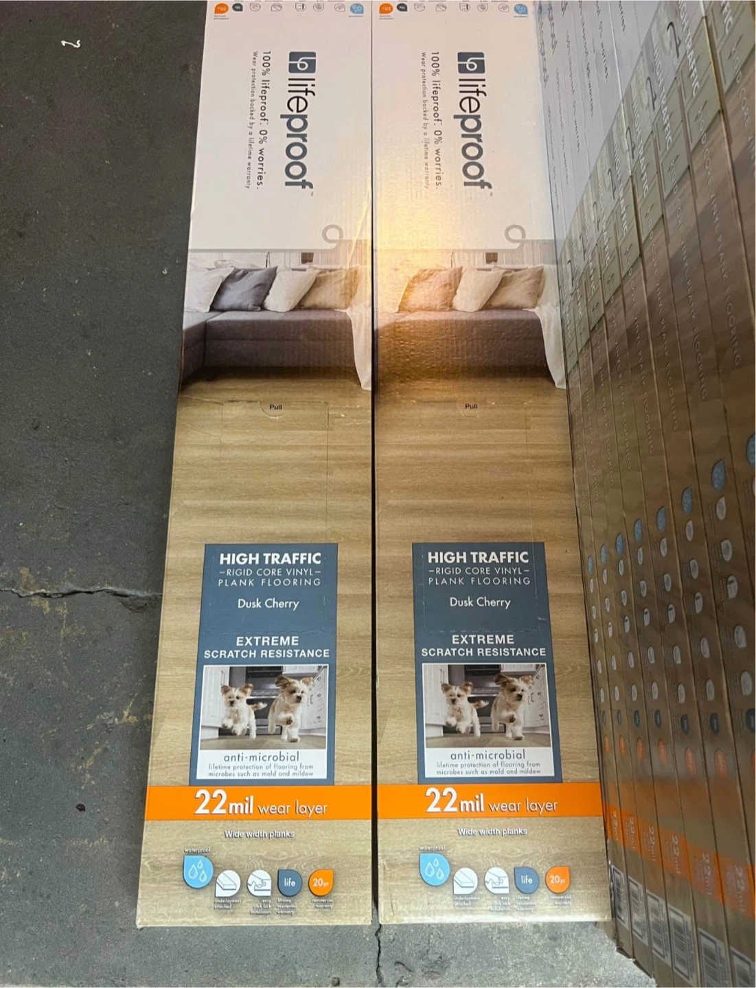 15Selling LifeProof rigid core vinyl plank flooring in the Dusk Cherry color! These planks are designed for high traffic areas and feature extreme scratch resistance. Each box contains 7 planks, covering 5.88 sq ft (220 mm x 1210 mm). They also have an anti-microbial layer for lifetime protection from microbes, mold, and mildew! The wear layer is 22mil and the planks are wide width I have a Brand new 60 boxes $48 each box.