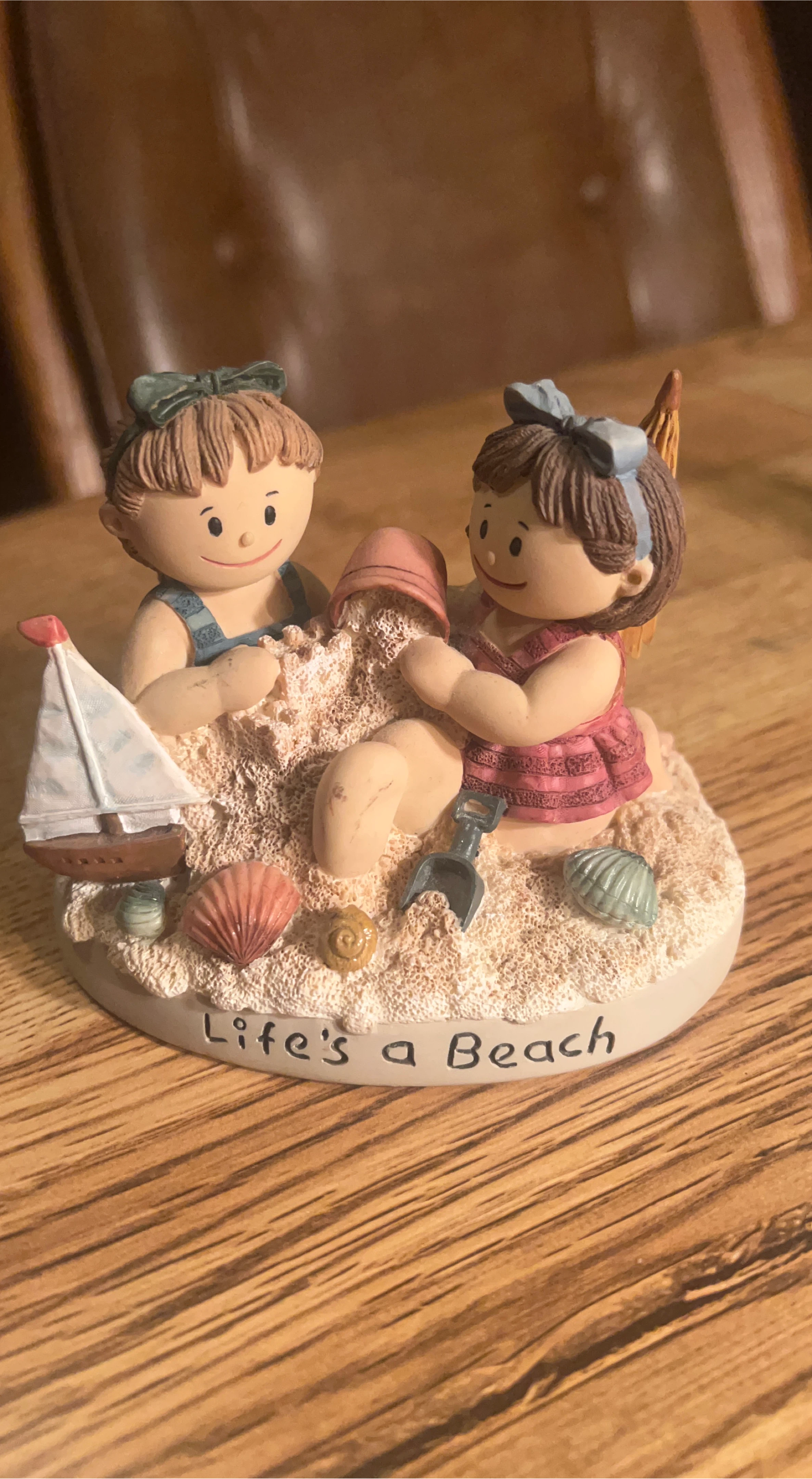 5This adorable figurine features two children playing in the sand with a sailboat and shells. The base says "Life's a Beach"