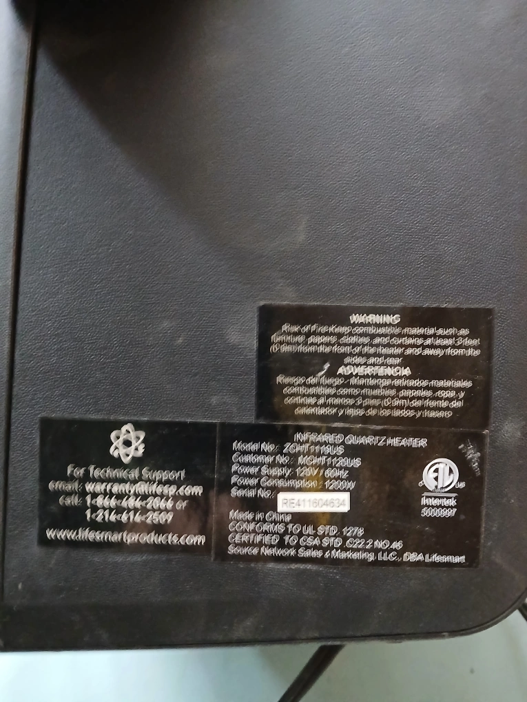 Selling a LifeSmart Infrared Quartz Heater, model number ZCHT1119US. It uses 120V/60Hz power supply and consumes 1250W. Feel free to ask any questions!