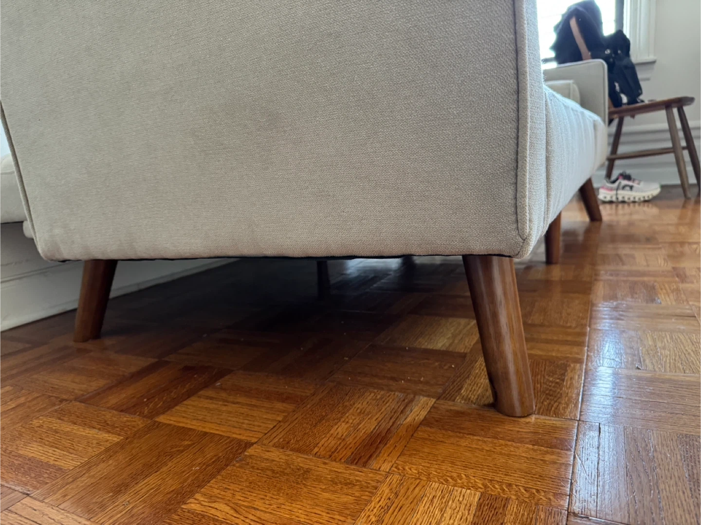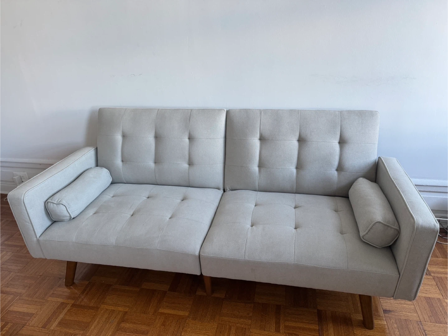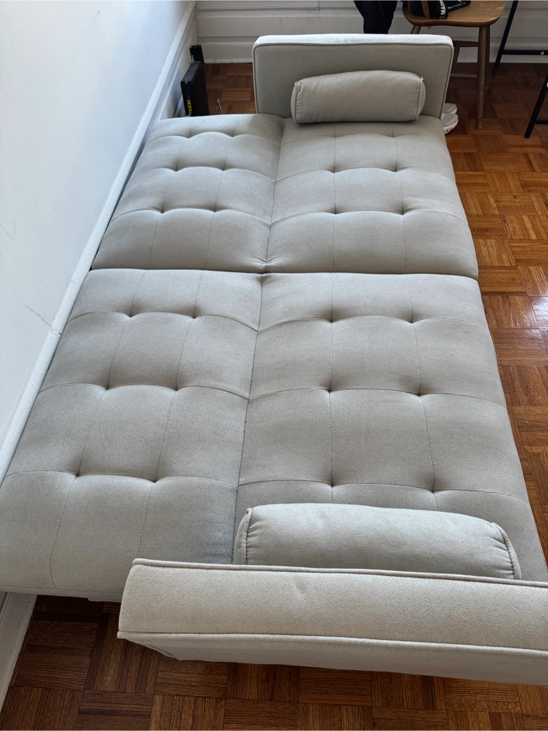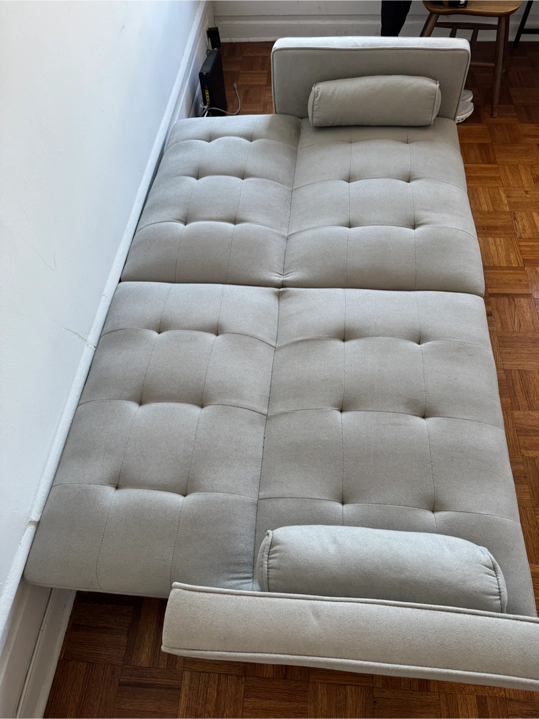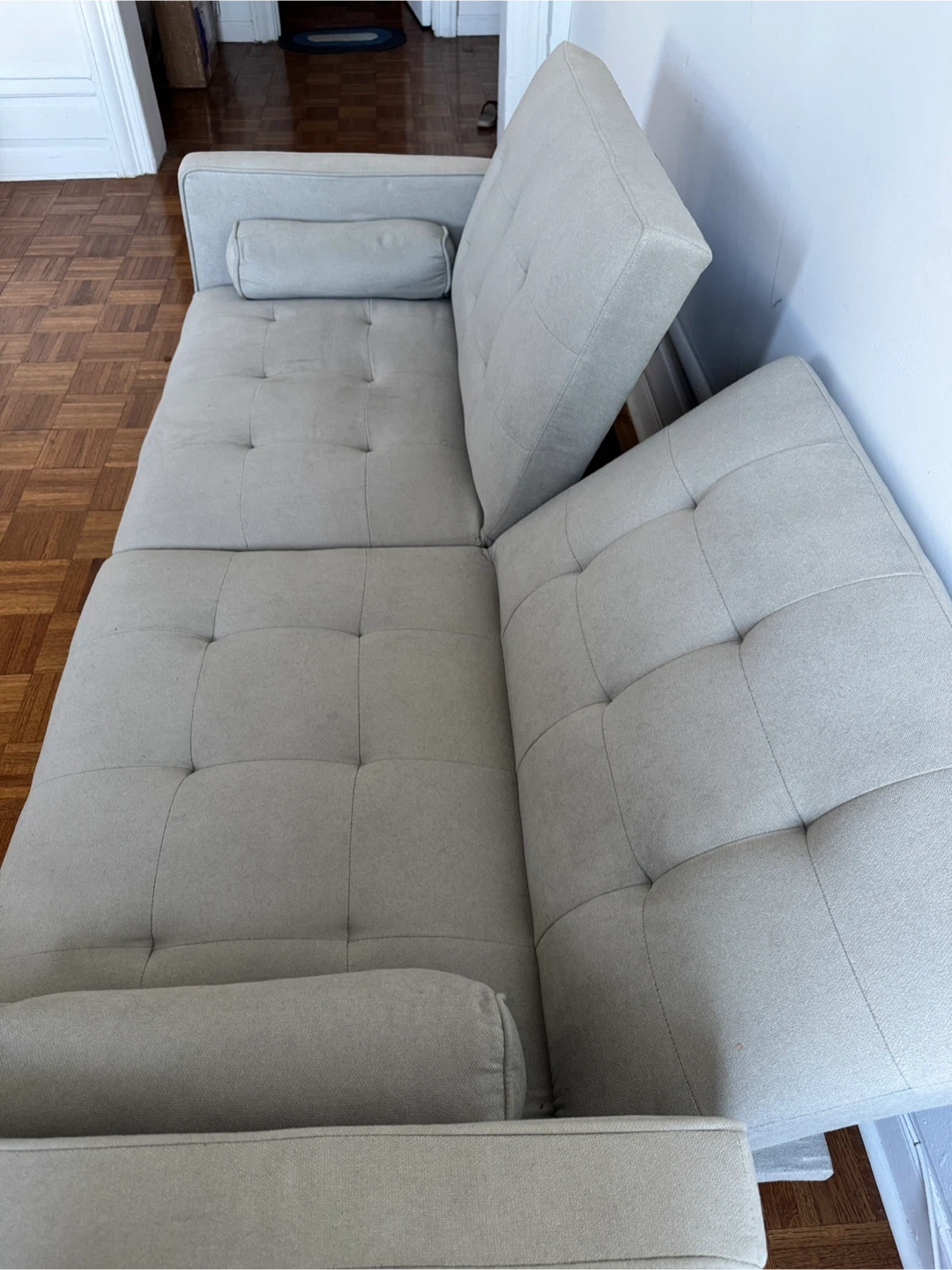 10Selling a light beige and greyish futon sofa bed! It's in great shape and can be used as a sofa or easily converted into a bed. Perfect for small spaces or guest rooms! It has a simple, modern design with a button-tufted seat and back, and it comes with two matching bolster pillows. Lightweight! Hardly used, moving out that’s why selling!