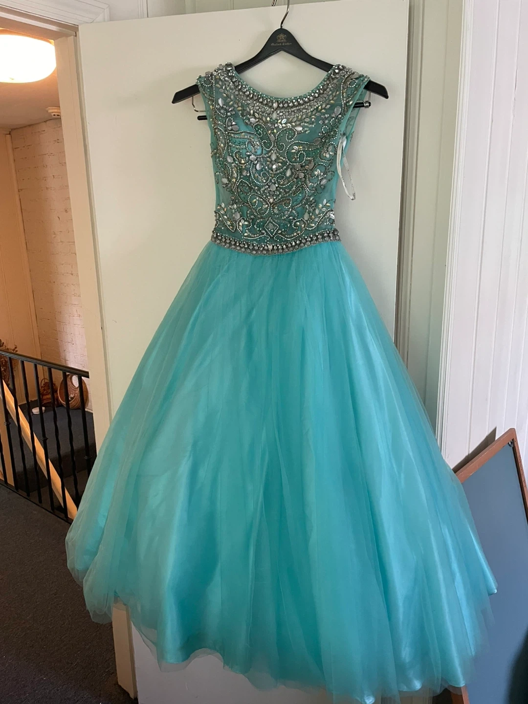 78Beautiful light blue prom dress with intricate beading on the bodice. The skirt is a flowy tulle material. Perfect for a special occasion!