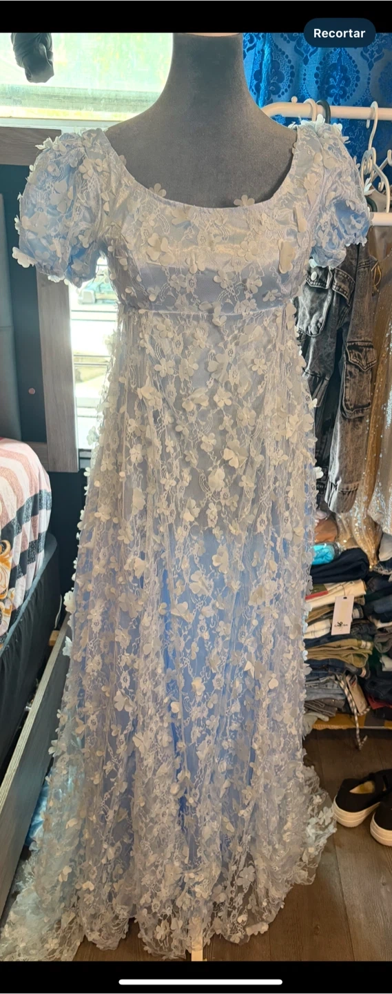 This is a beautiful light blue dress with delicate floral lace detailing. It is in great condition and ready for a new home!