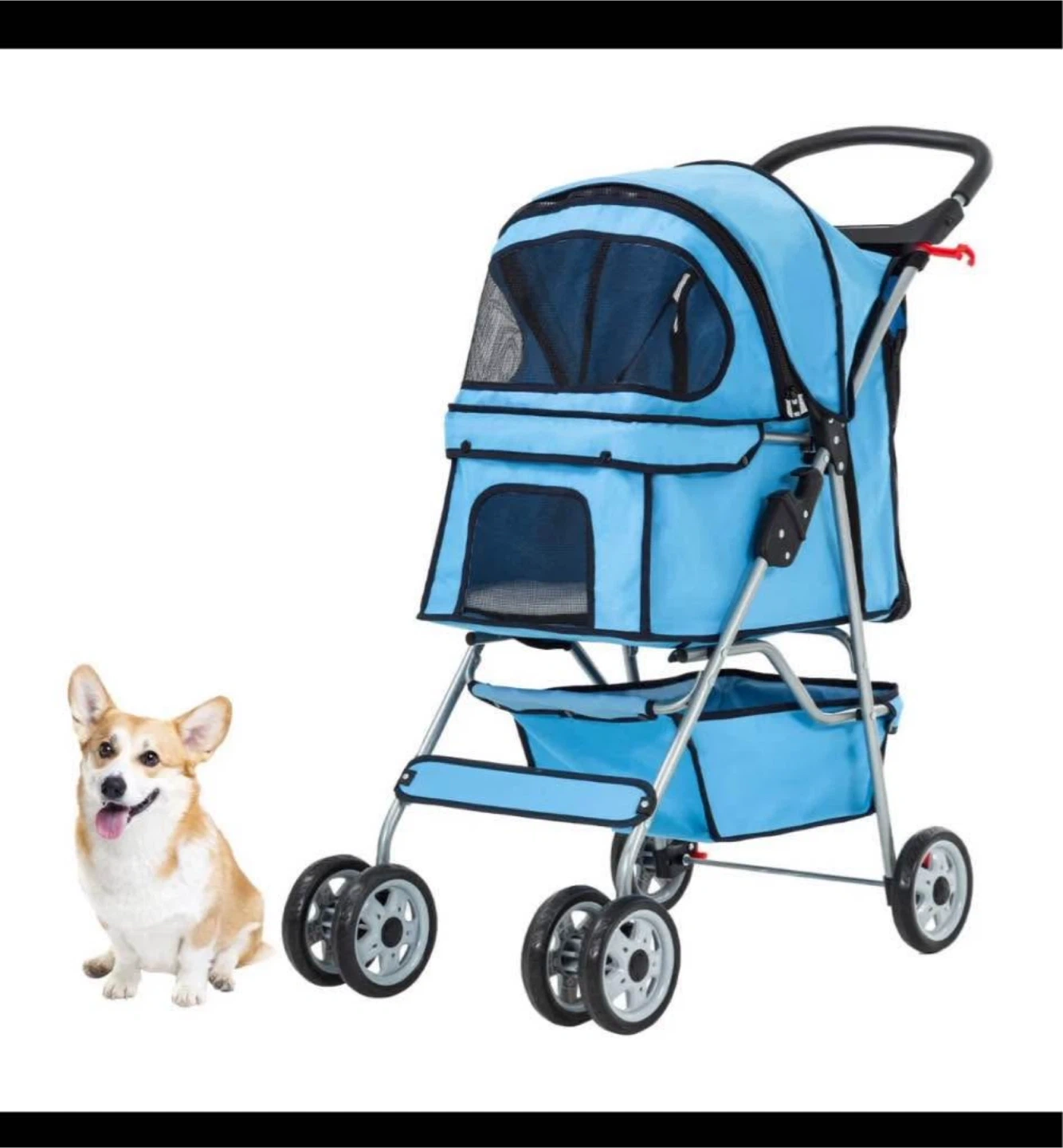 This light blue pet stroller is perfect for taking your furry friend on walks! It features a comfortable and secure compartment for your pet, along with a convenient handle for easy pushing. The stroller also has a storage basket underneath for your essentials. Used a handful of times but my dog cries being in it so it’s up for grabs. It’s in the trunk of my car, will wipe down completely before pick up.