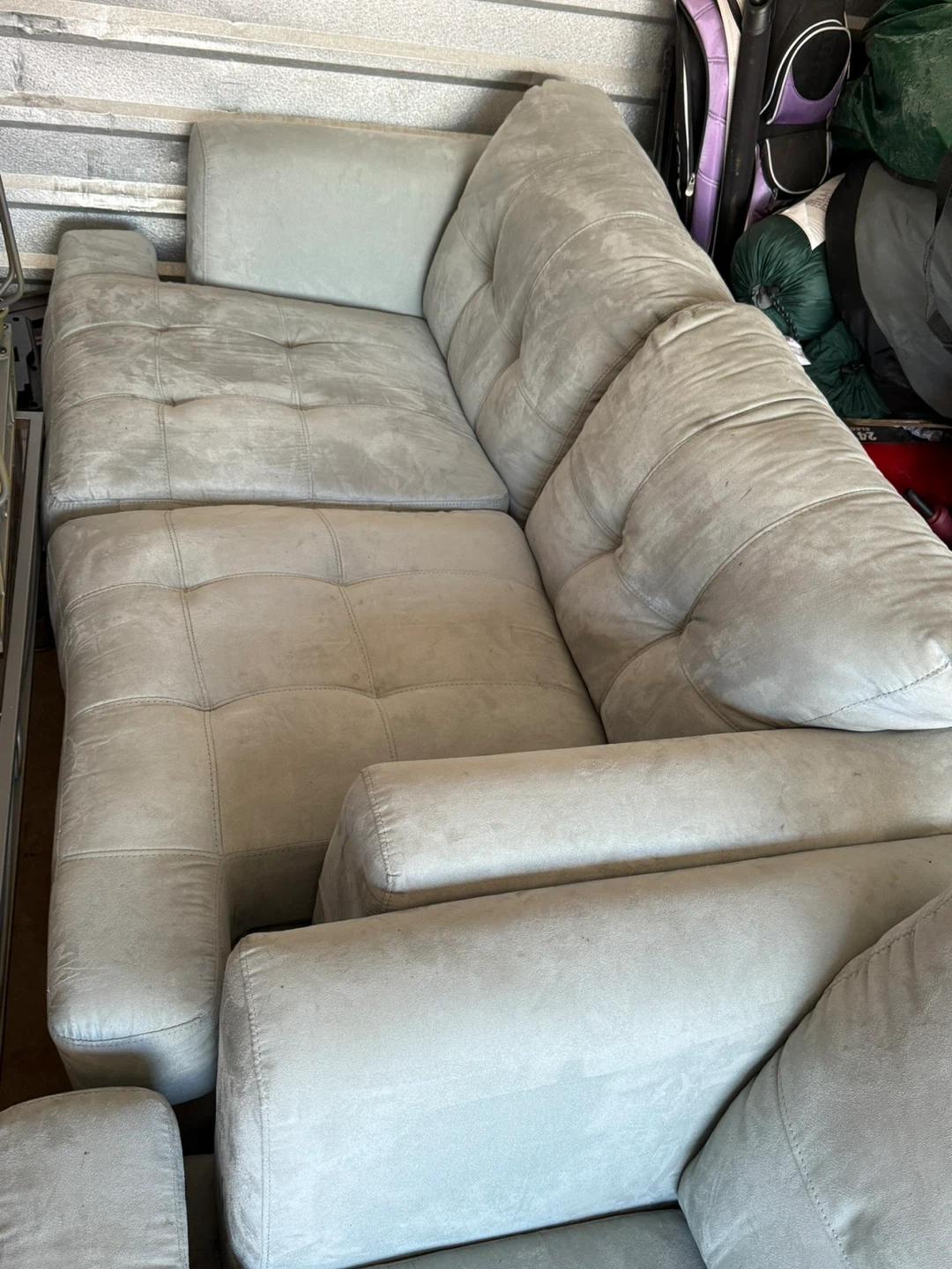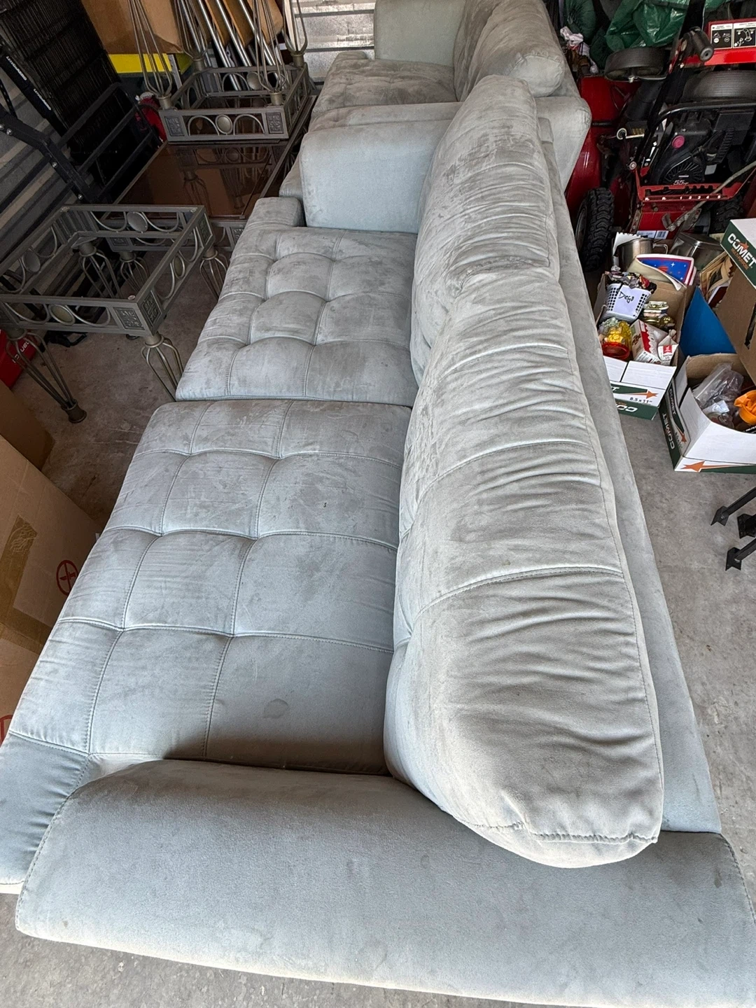 Selling a comfortable sectional sofa and love seat in a light blue color. It's perfect for a living room or entertainment area. The sofa has a tufted design and plush cushions for extra comfort. Great for lounging and relaxing!