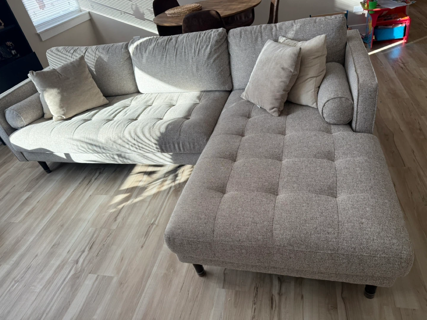 10Selling a comfy light gray sectional sofa! It features a stylish, tufted design and comes with several throw pillows. Perfect for a living room or entertainment space