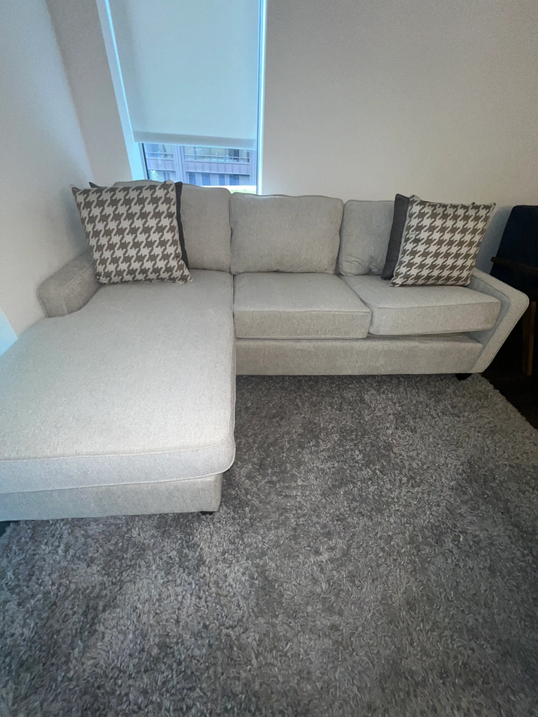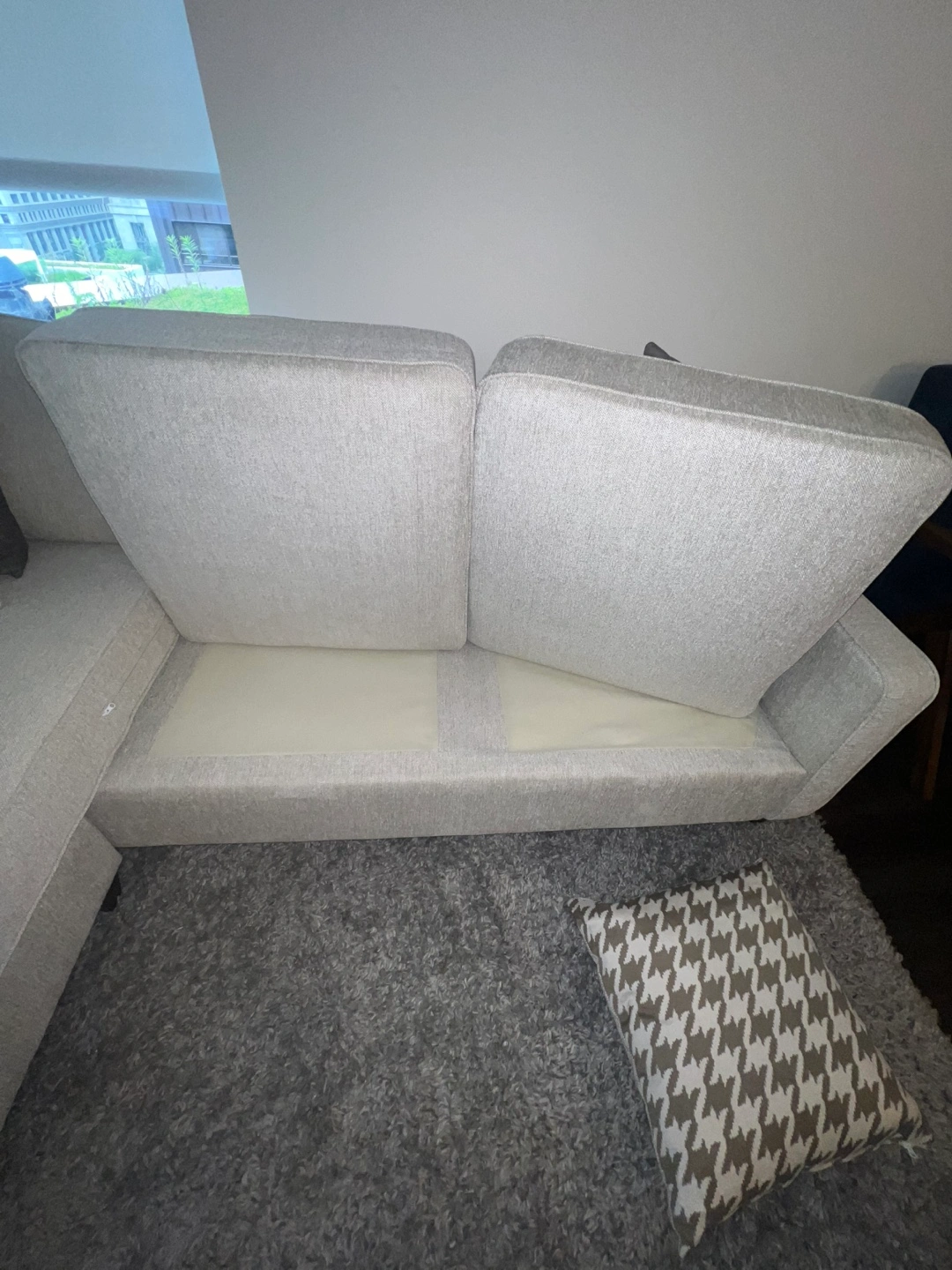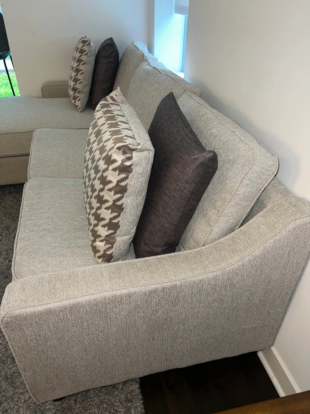 Selling a light gray sectional sofa! It's in great condition and has a convenient storage compartment built in. Perfect for decluttering your living space and adding a touch of style to your home