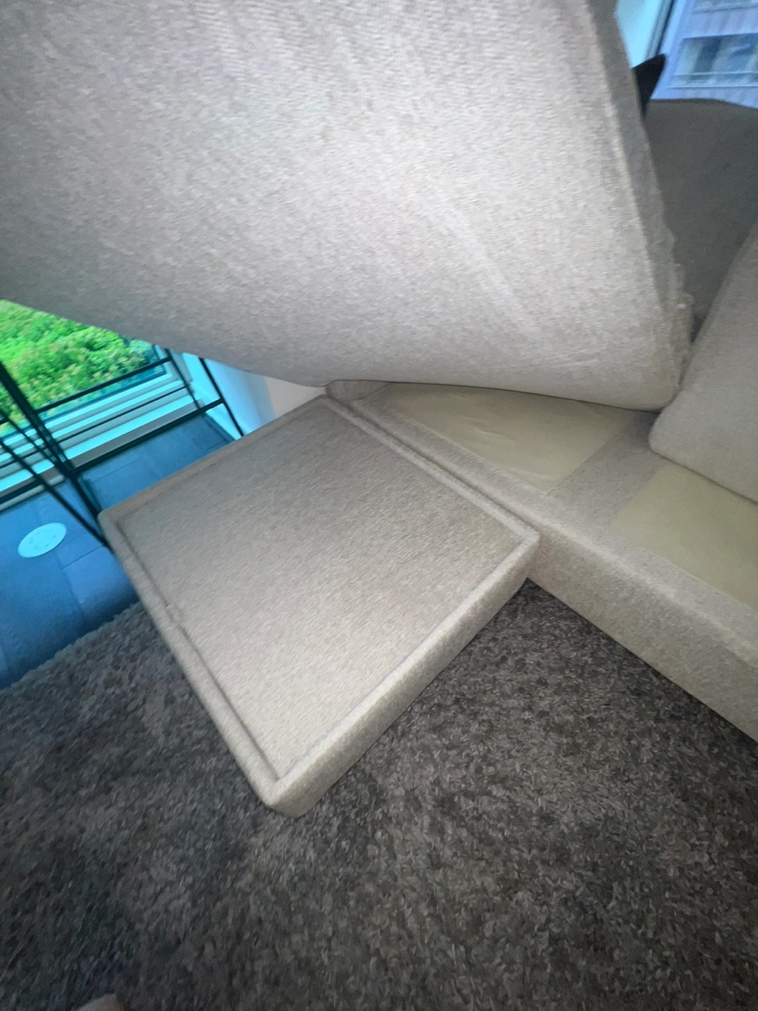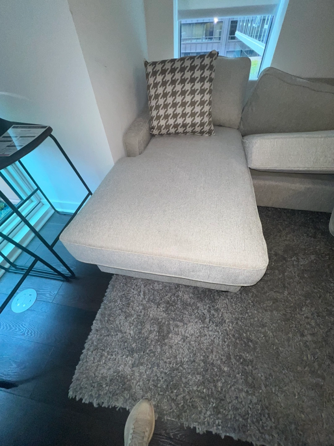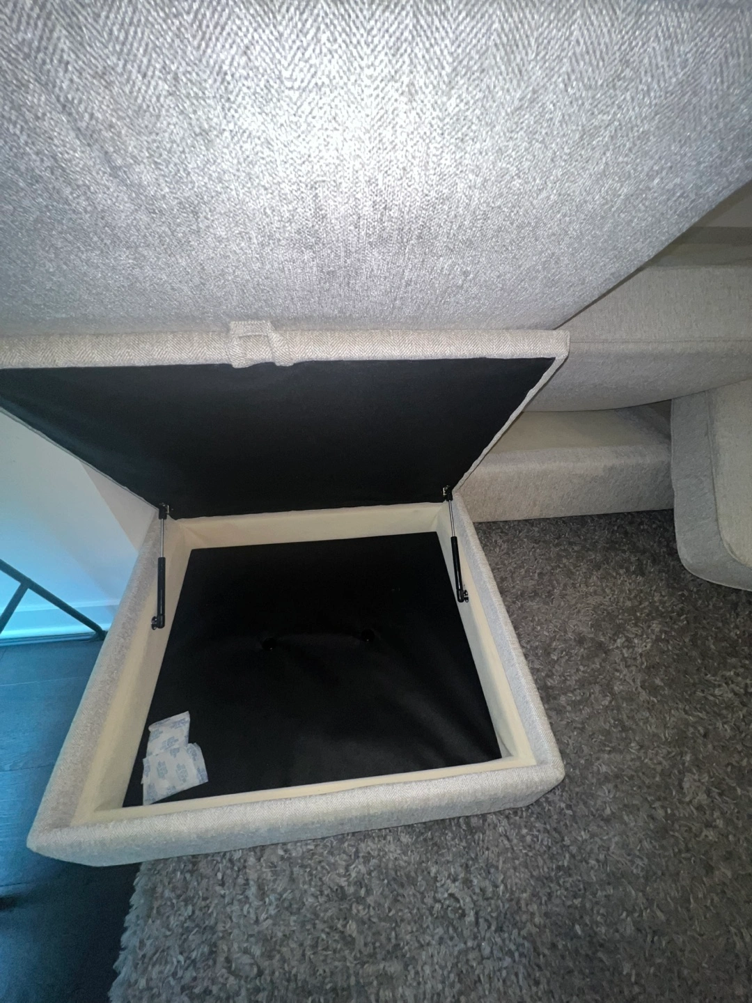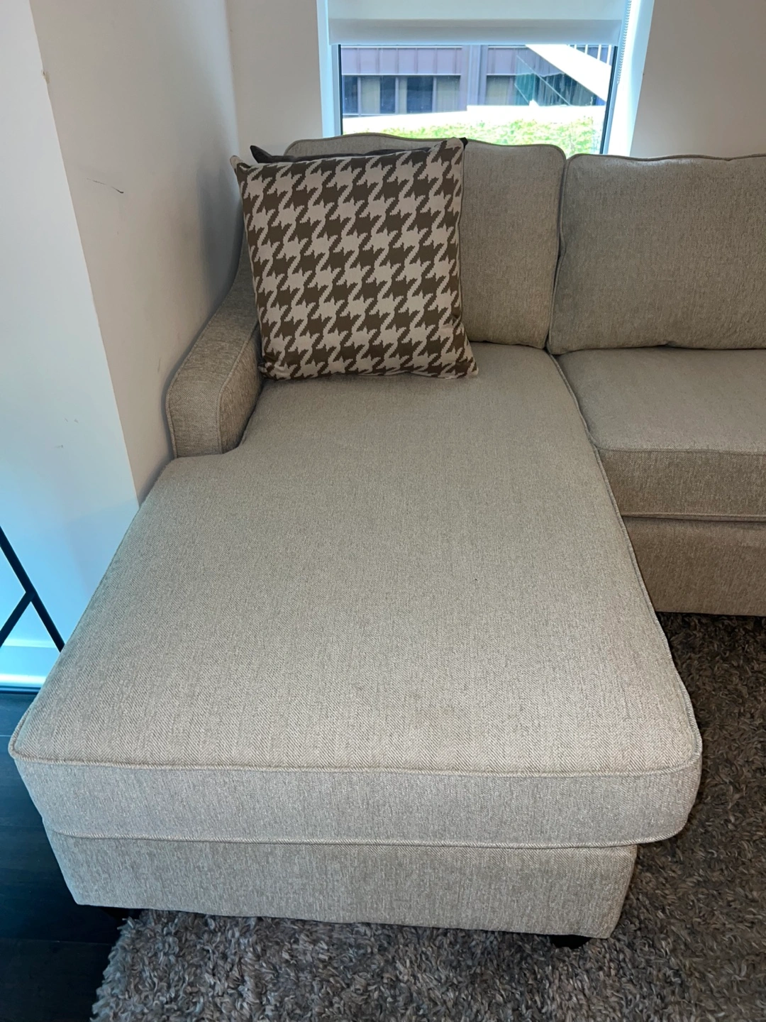 Selling a light gray sectional sofa! It's in great condition and has a convenient storage compartment built in. Perfect for decluttering your living space and adding a touch of style to your home