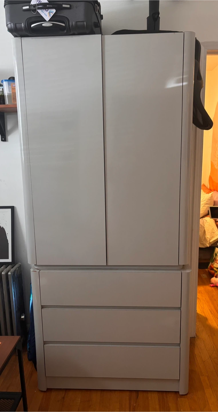 Light grey armoire. Formica material, easy to clean and scratch resistant. Lightly used. There is also a matching desk listed if interested. Pickup in Williamsburg (Brooklyn) The armoire has 3 drawers and 2 shelves, and a hanger rod. Option to remove shelves to just utilize hanger rod. Doors press to open/close Armoire dimensions: 35in W x 22in D x 77.5in H Drawers 6in H x 21in D It is being used for storage currently, any items inside will be removed prior to pickup