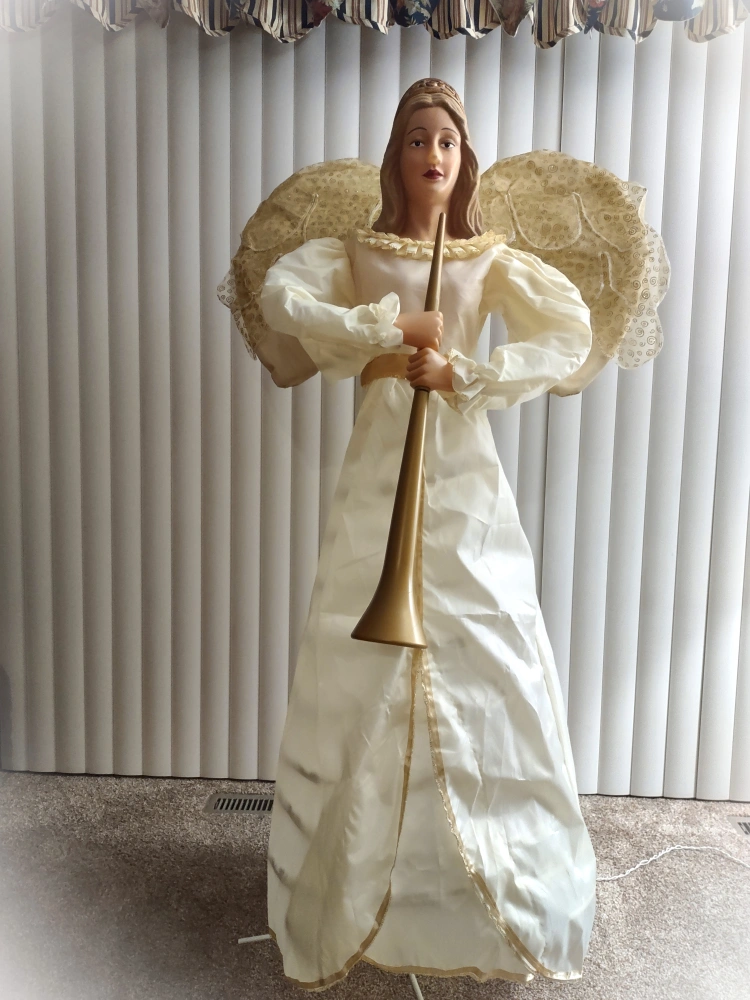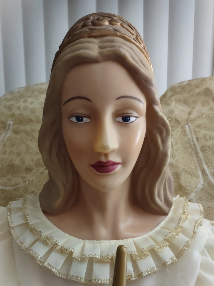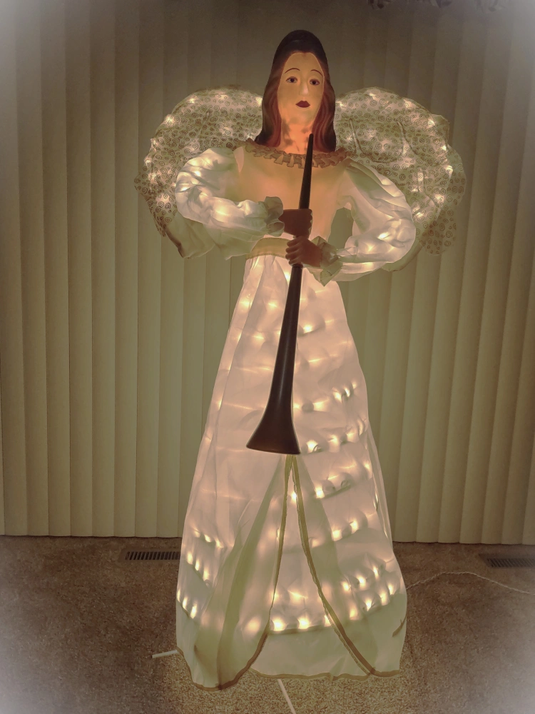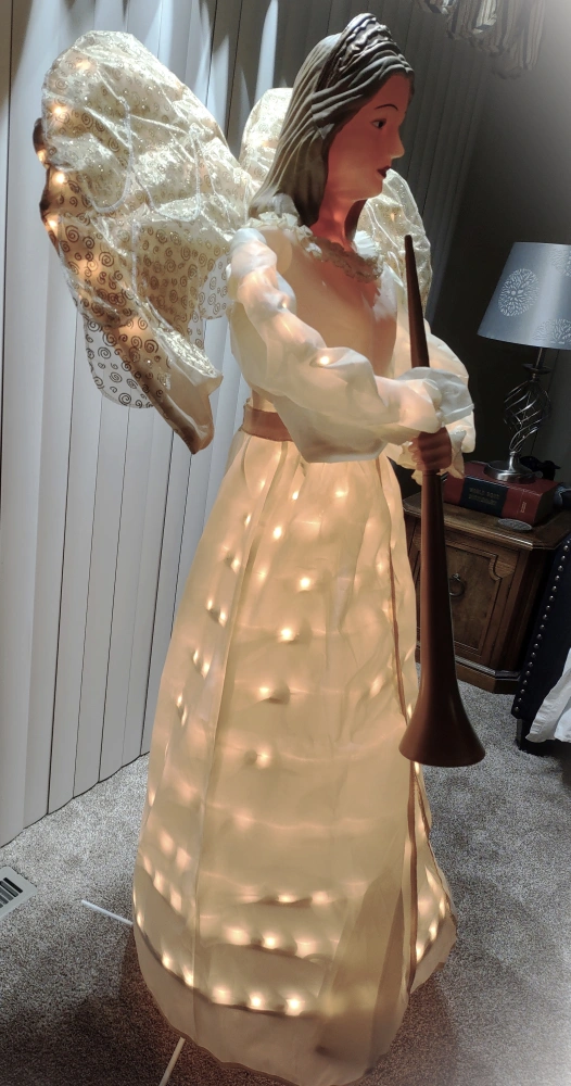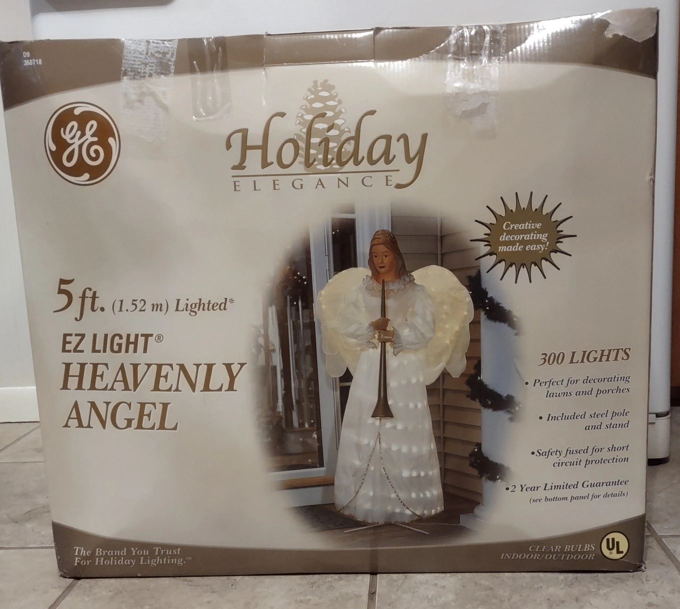 PLEASE READ ALL OF THIS DESCRIPTION. Circa 2005 - Very Rare This eloquent Heavenly Angel is 5’ tall. Her wings are adorned with lace and glitter and her clothing is of satin-like material. There are 300 cool burning bulbs which are safety fused for short circuit protection. Plug system is single end/add-on. UL listed for indoor/outdoor use. Although this décor is suitable for indoor/outdoor use, we only used it indoors. She is just too beautiful to put outside! A wonderful addition to any Christmas setting in a church, home or anywhere. Like new condition. No cracks, chips, dents, marring on the body. No holes or tears in the clothing or wings. Clean, no dirt, no odor (non-smoking and pet free home). The trumpet is slightly loose where it connects (see photo). Includes original instructions and box. We are the original owner (purchased new) of this item. CASH ONLY at time of pick-up in Gilberts, IL. No other form of payment accepted. No delivery or shipping available.