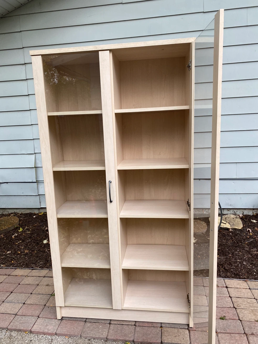 65Selling a wood bookshelf cabinet never used. It's in great shape and ready for a new home! The height is about 71 inches, and the width is around 13 inches. Perfect for storing books or displaying your favorite items.