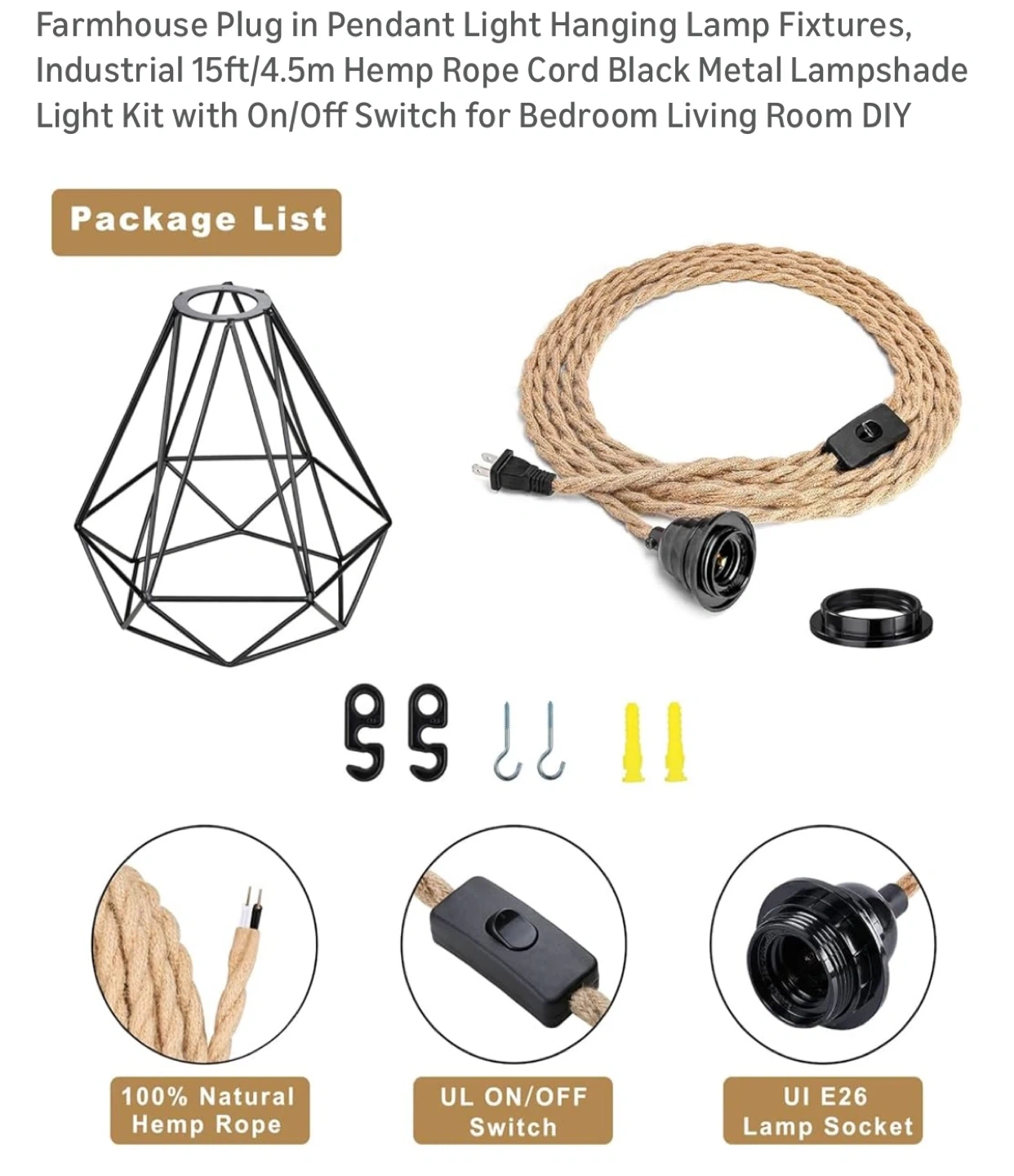 Selling a farmhouse plug-in pendant light with a 15ft hemp rope cord. It has a black metal lampshade and an on/off switch. Perfect for adding an industrial touch to your bedroom or living room!