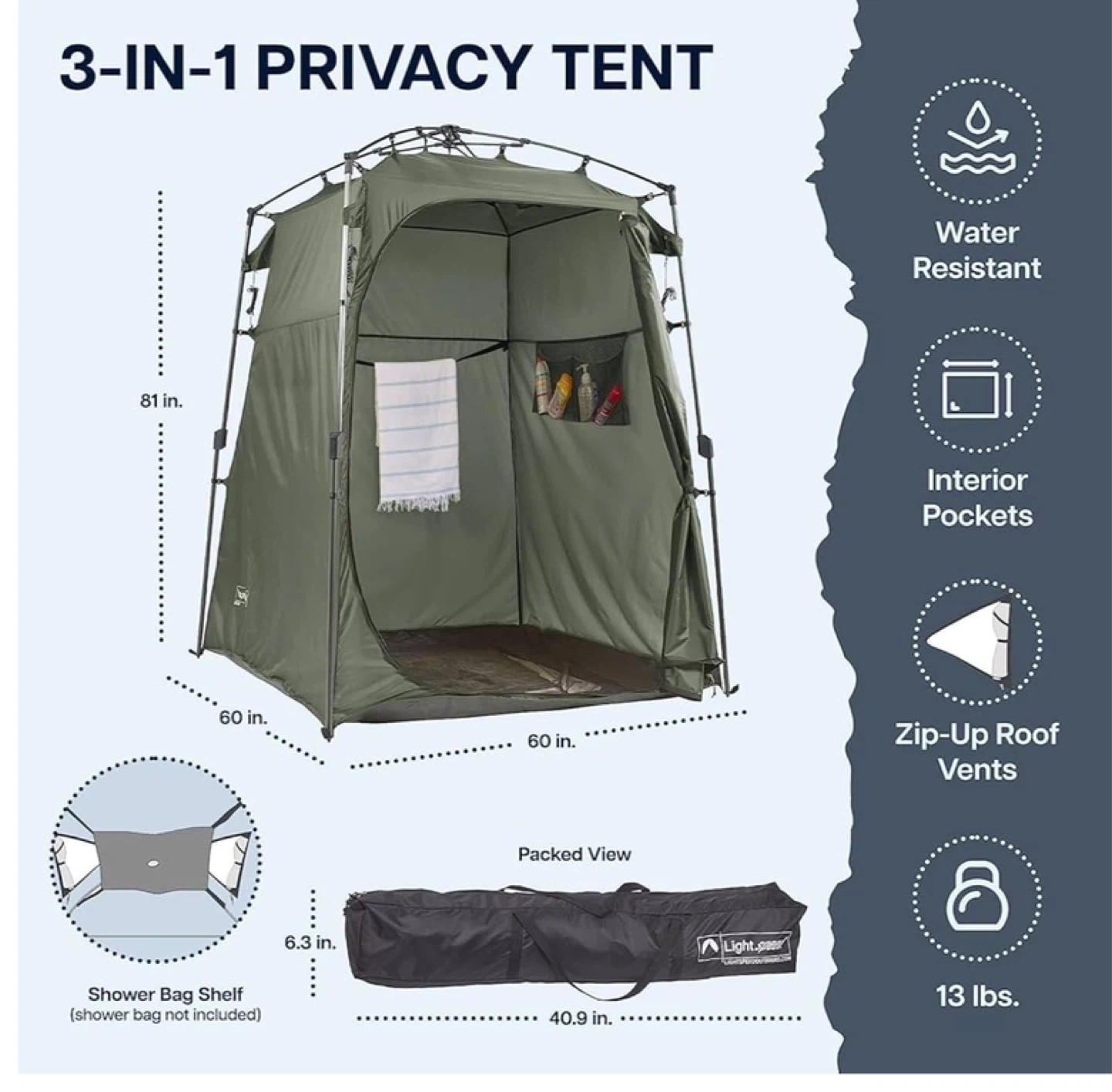 10This is a Lightspeed Outdoors 3-in-1 Privacy Tent. It's water resistant and has interior pockets. It also features zip-up roof vents. When packed, it weighs 13 lbs and measures 40.9 inches long. The tent itself is 81 inches tall and 60 inches wide.
