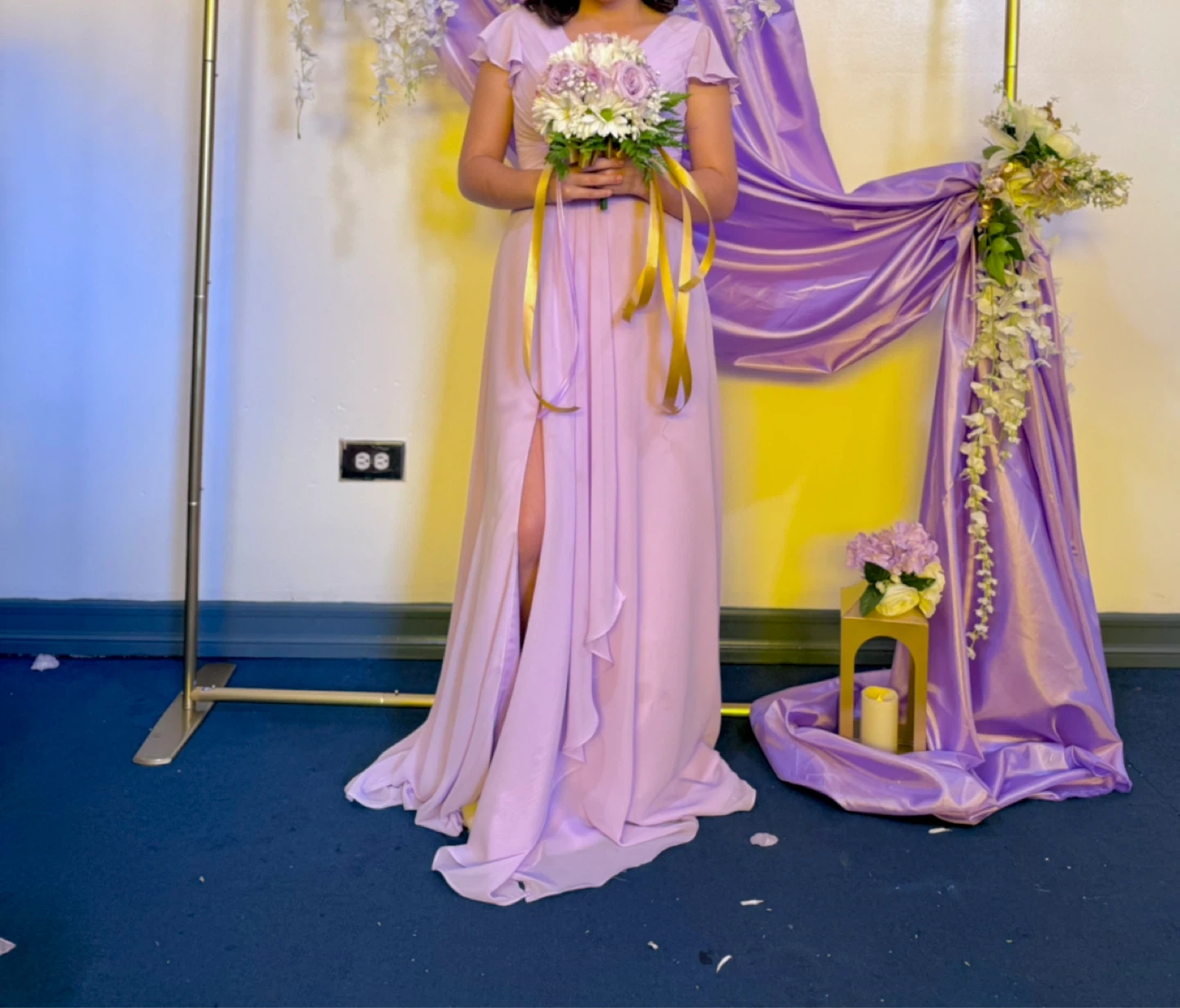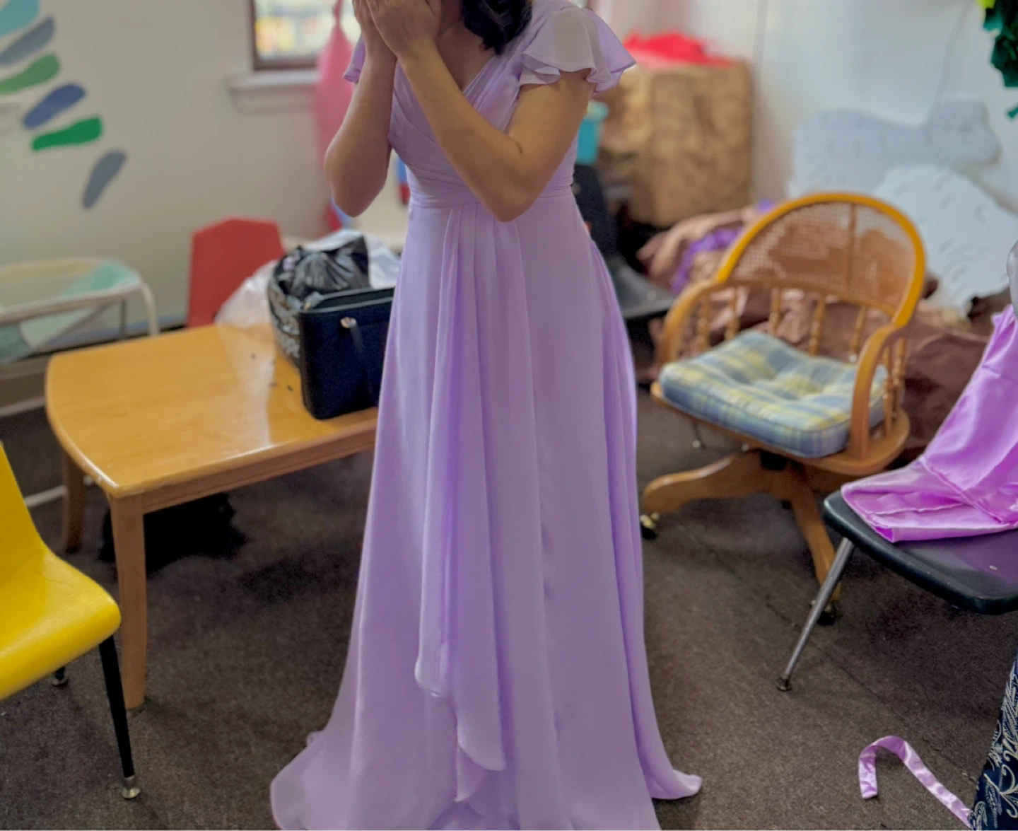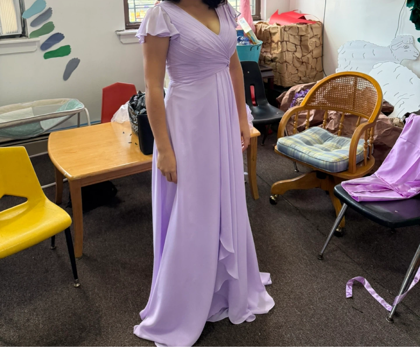Selling a beautiful lilac bridesmaid dress. It features a v-neck and a slit. Perfect for a wedding or special occasion