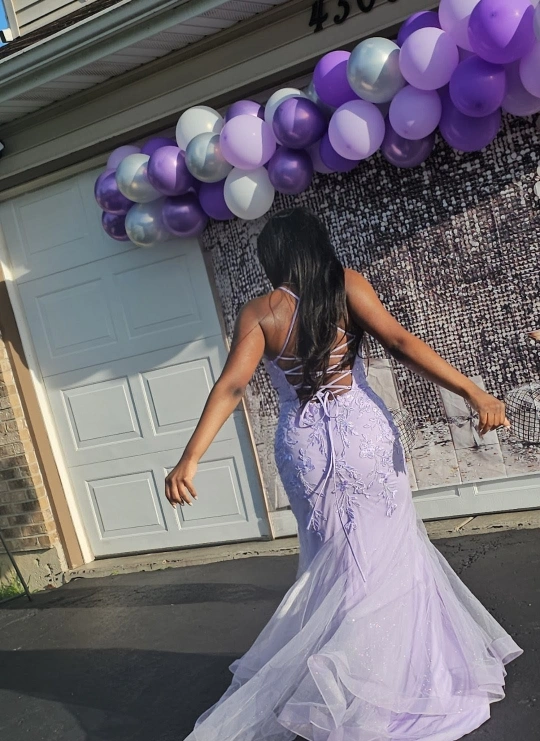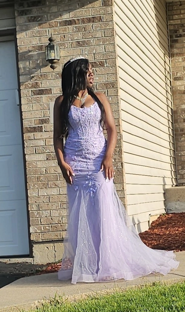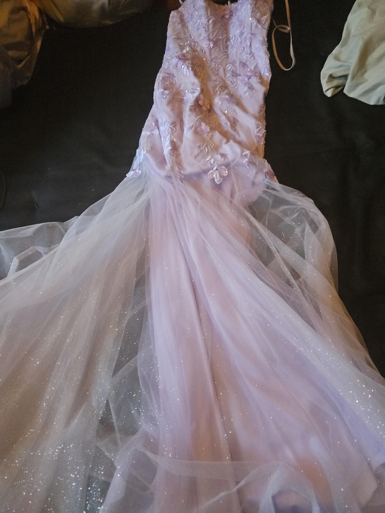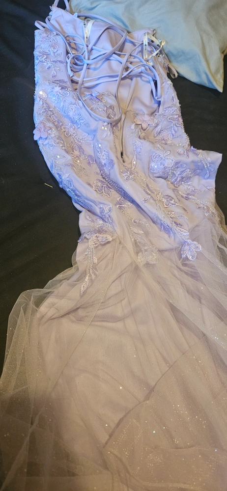 Selling a beautiful lilac prom dress. It has a lace-up back and floral detailing on the bodice. The skirt is a sparkly tulle material. It's in great condition!