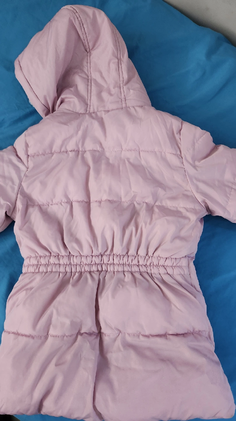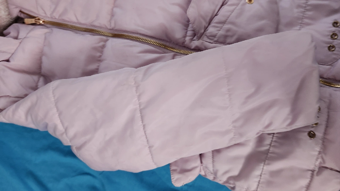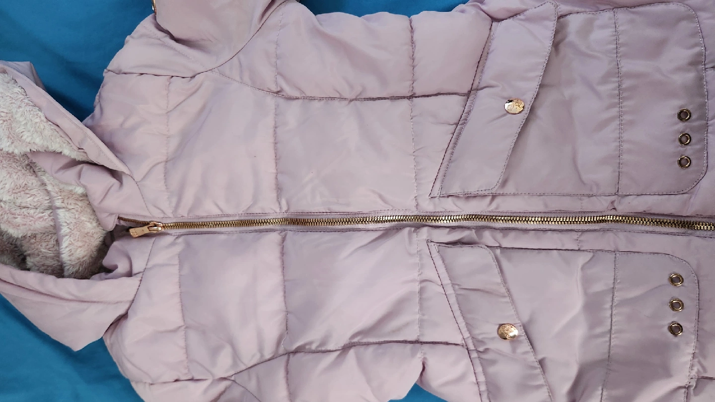 60Here's a cozy lilac puffer jacket! It's perfect for keeping warm on chilly days. The jacket features a hood and a zip-up front. It's in great condition and ready for a new home