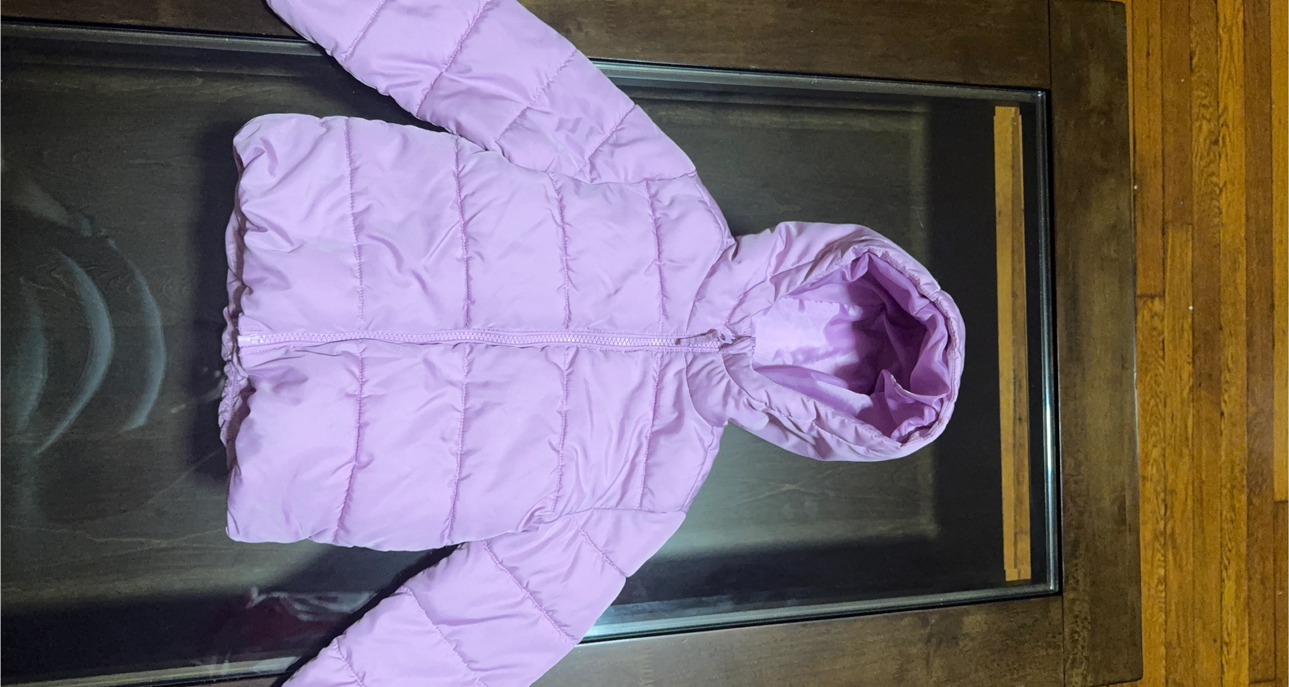 Here's a lilac puffer jacket! It's a light purple color and features a hood. Perfect for cooler weather