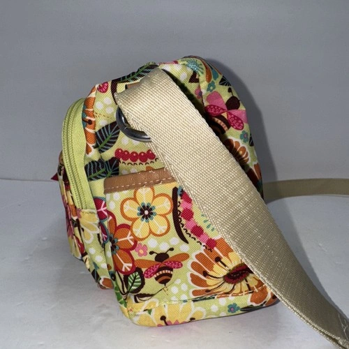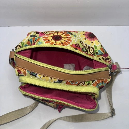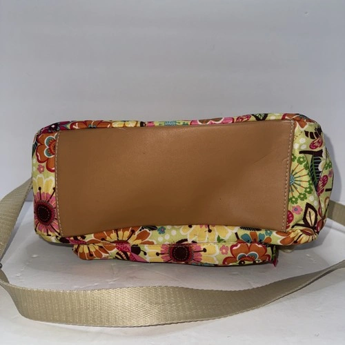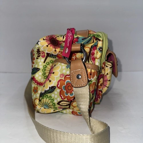 65The Lily Bloom Multicolored Floral Print 5 Compartment Tote Shoulder Purse Bag is a large rectangular shoulder bag with a beautiful floral pattern in blooms print. It features a zip closure, brown faux leather handles, and silver hardware accents. The bag is made of recycled polyester with a polyester lining in a multi-color design. Suitable for travel, casual outings, and business events, this stylish purse from Lily Bloom is perfect for women who appreciate colorful and vibrant accessories. With its unique character and spacious compartments, it is a practical yet fashionable choice for everyday use.