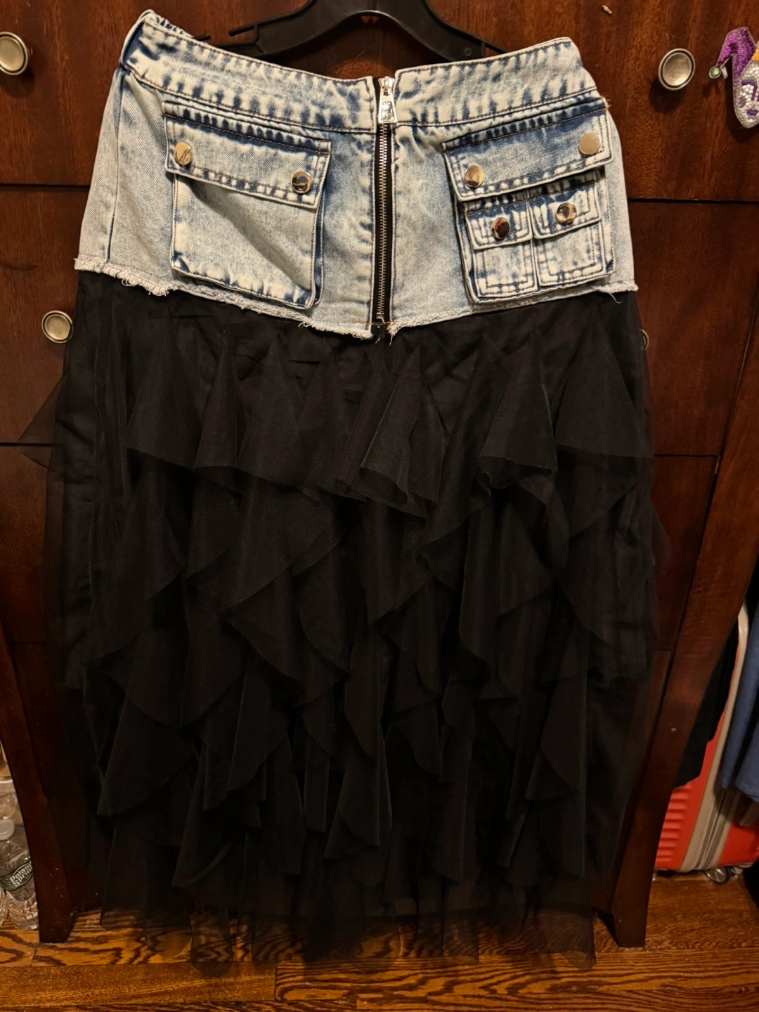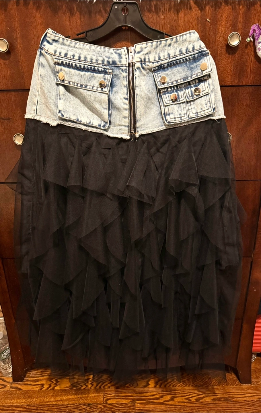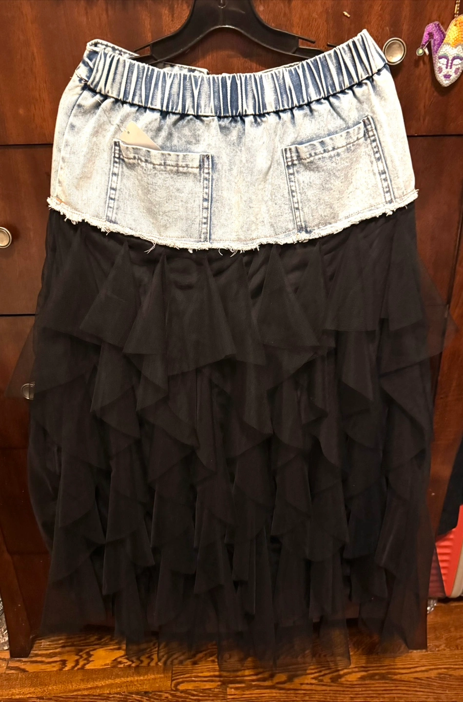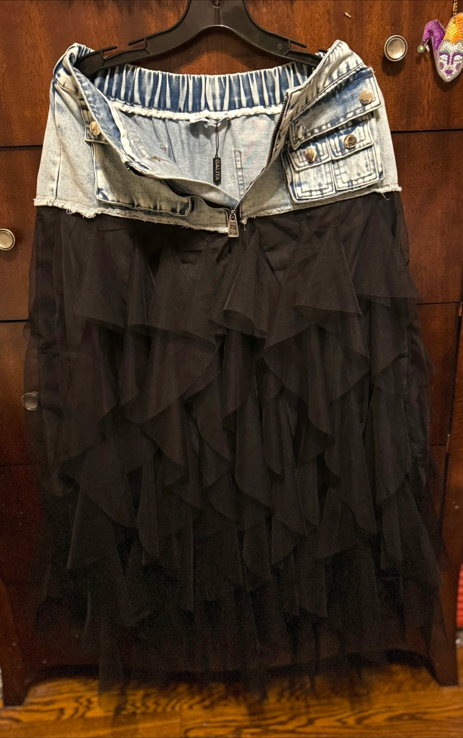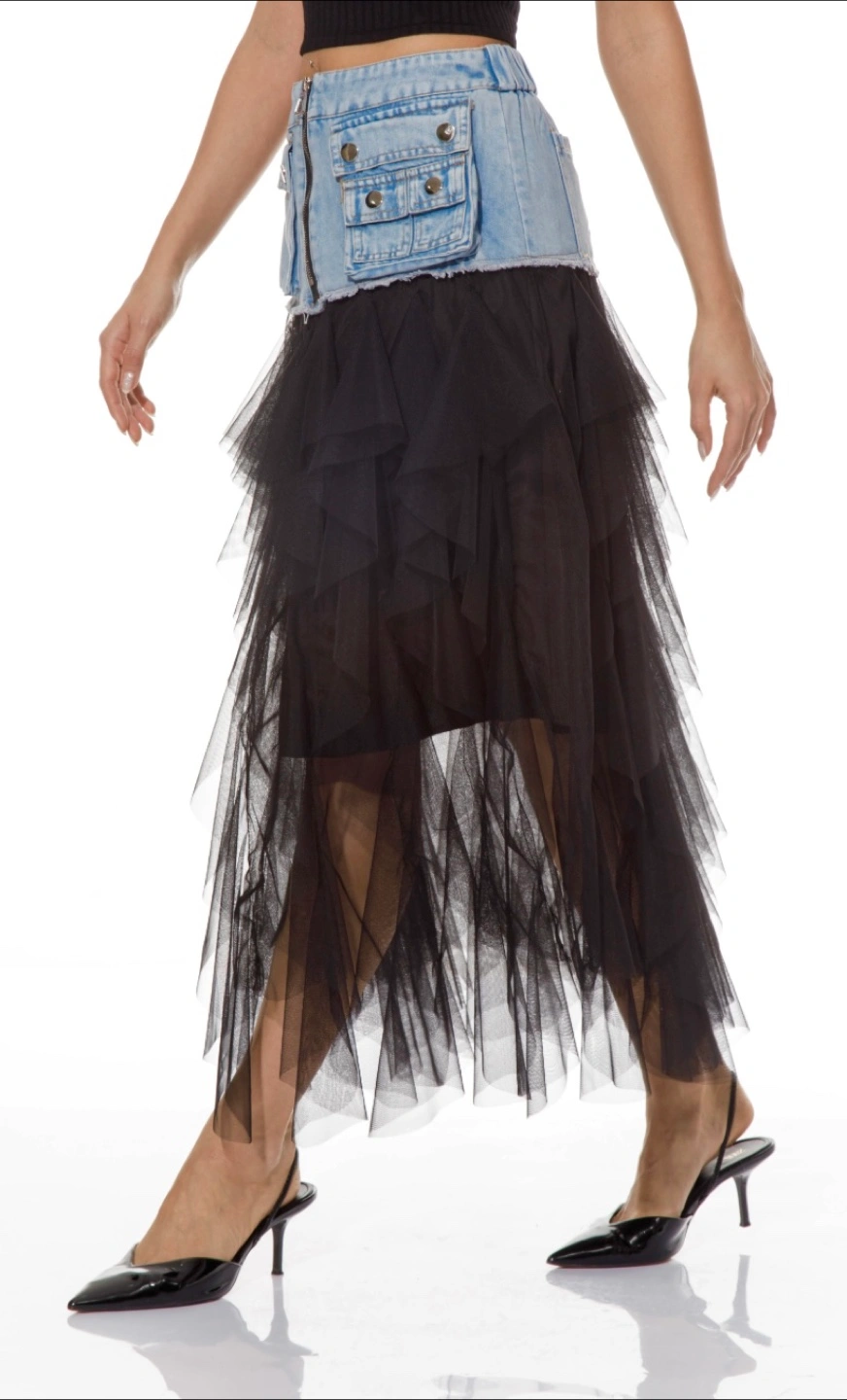 Limited!! One of a kind! You won’t see it elsewhere. This stylish skirt features a unique combination of denim jeans and black organza tulle ruffles, perfect for a chic and modern wow look. Ideal for casual outings or a night out. NWT Imported Size M