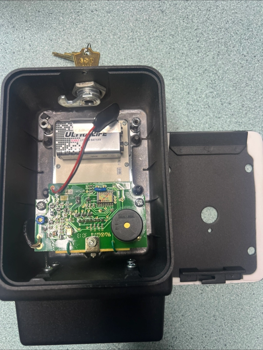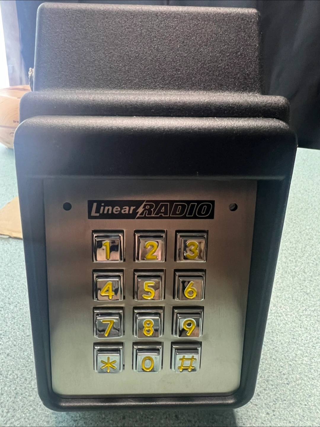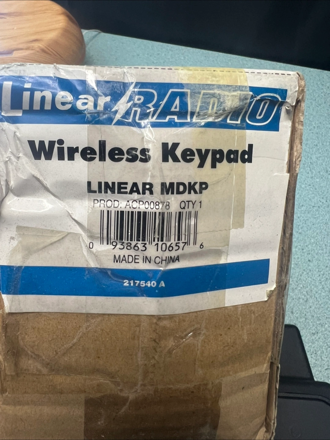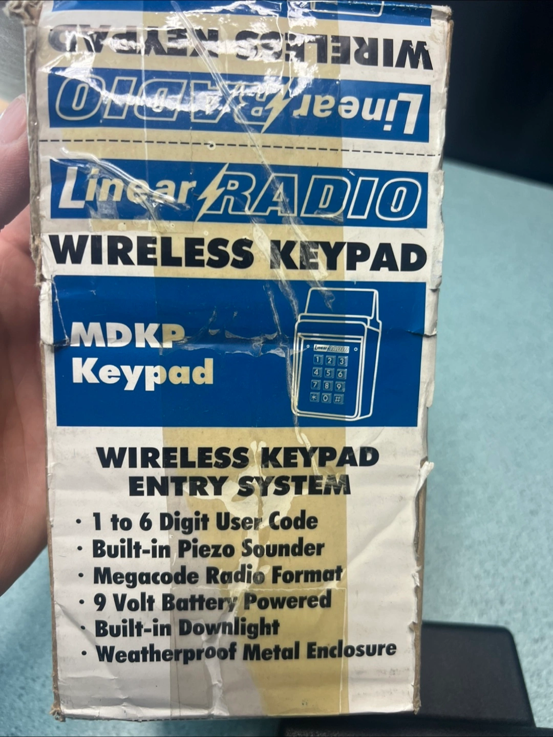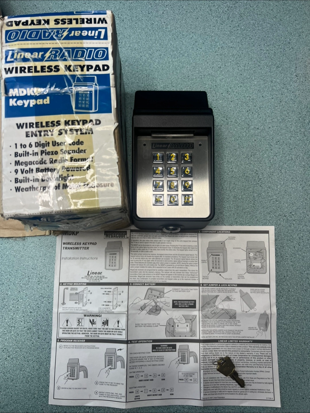 73Wireless keypad. Includes box, instructions, and key. 9-volt battery powered. Weatherproof enclosure. New, never used.