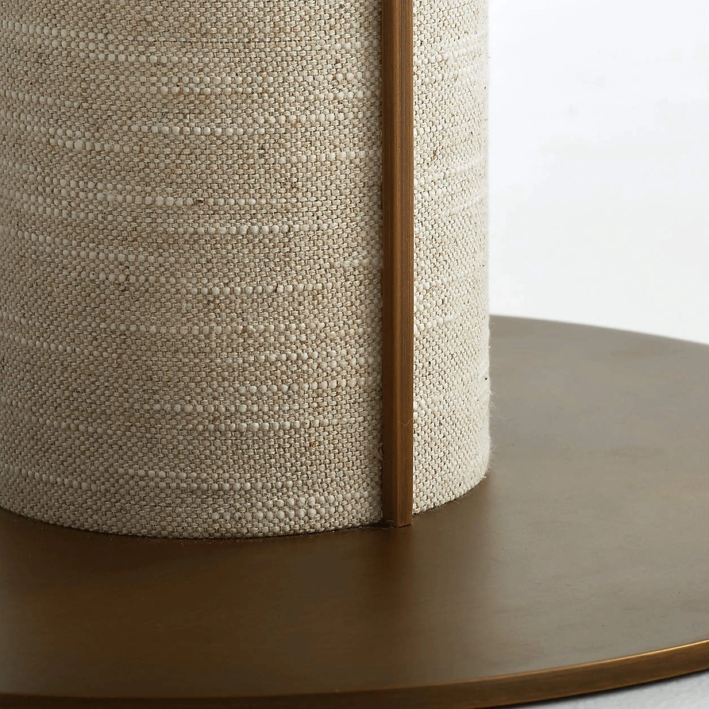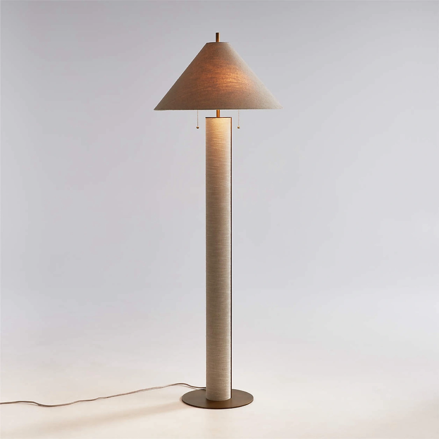 This is a stylish floor lamp with a linen shade and a bronze-colored base. It will add a touch of elegance to any room. The lamp is in great condition and ready to brighten up your space