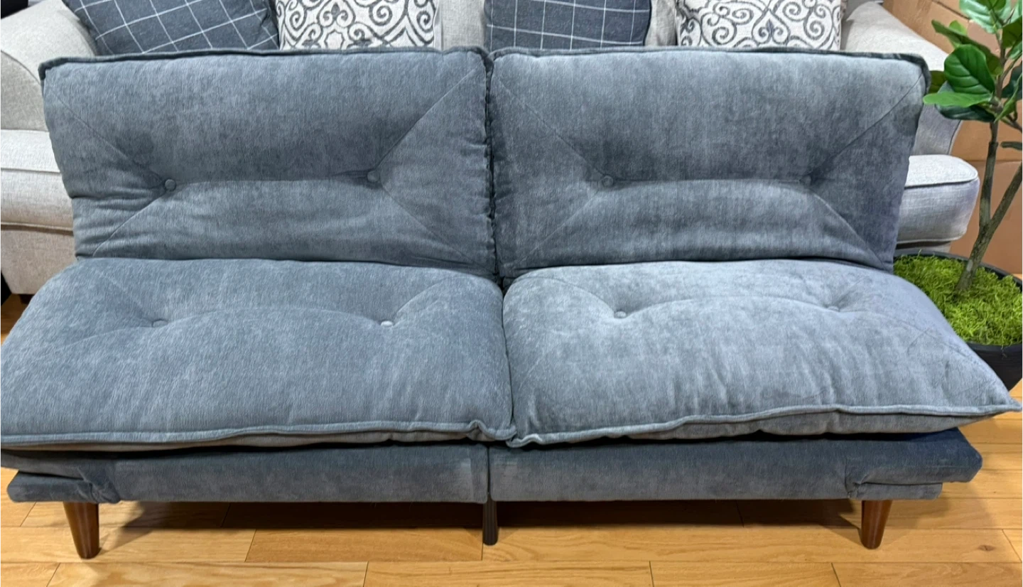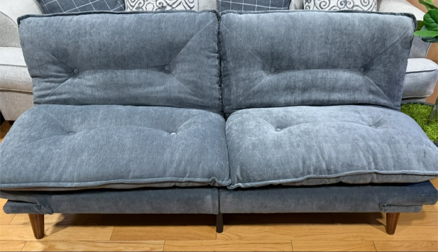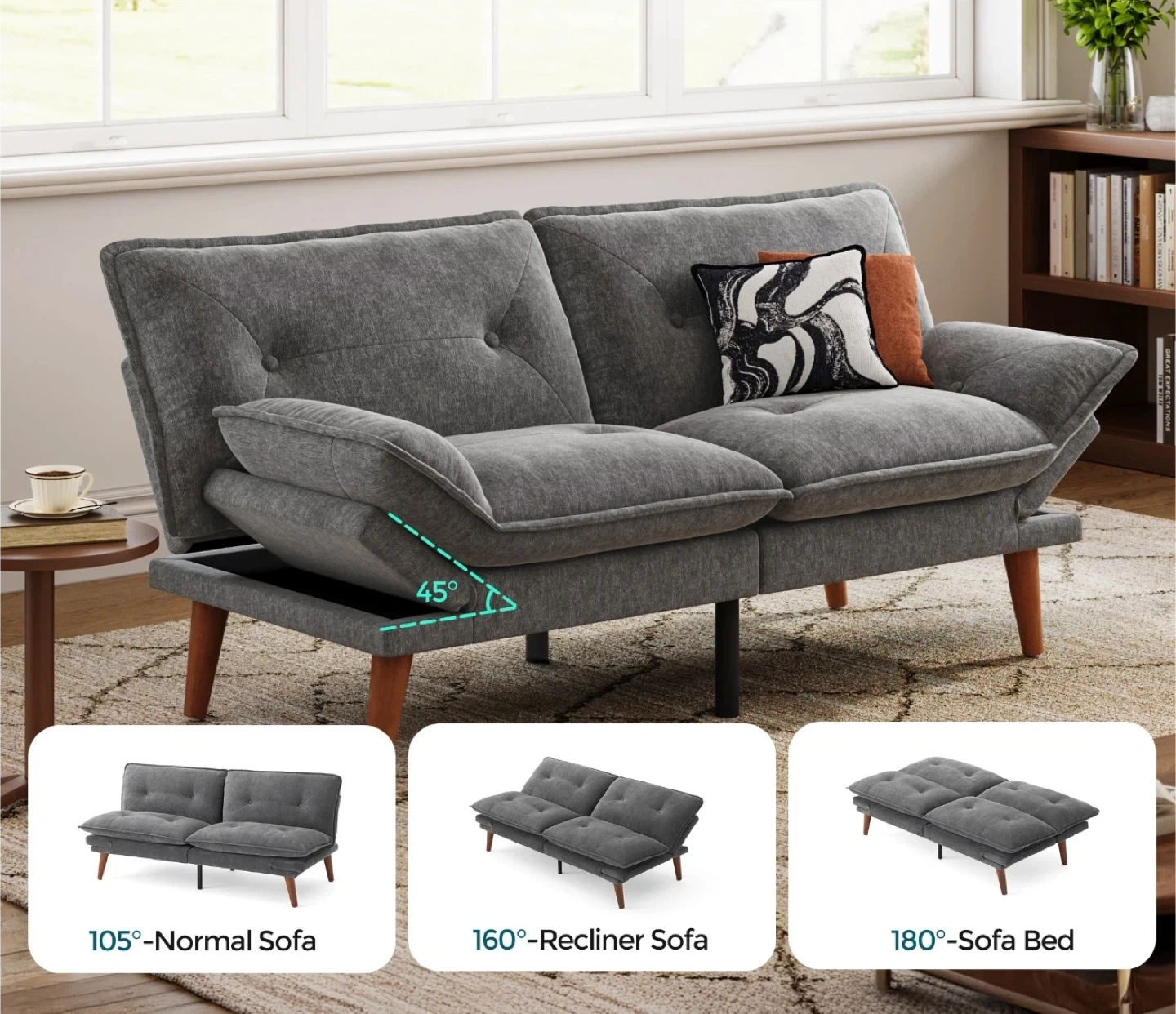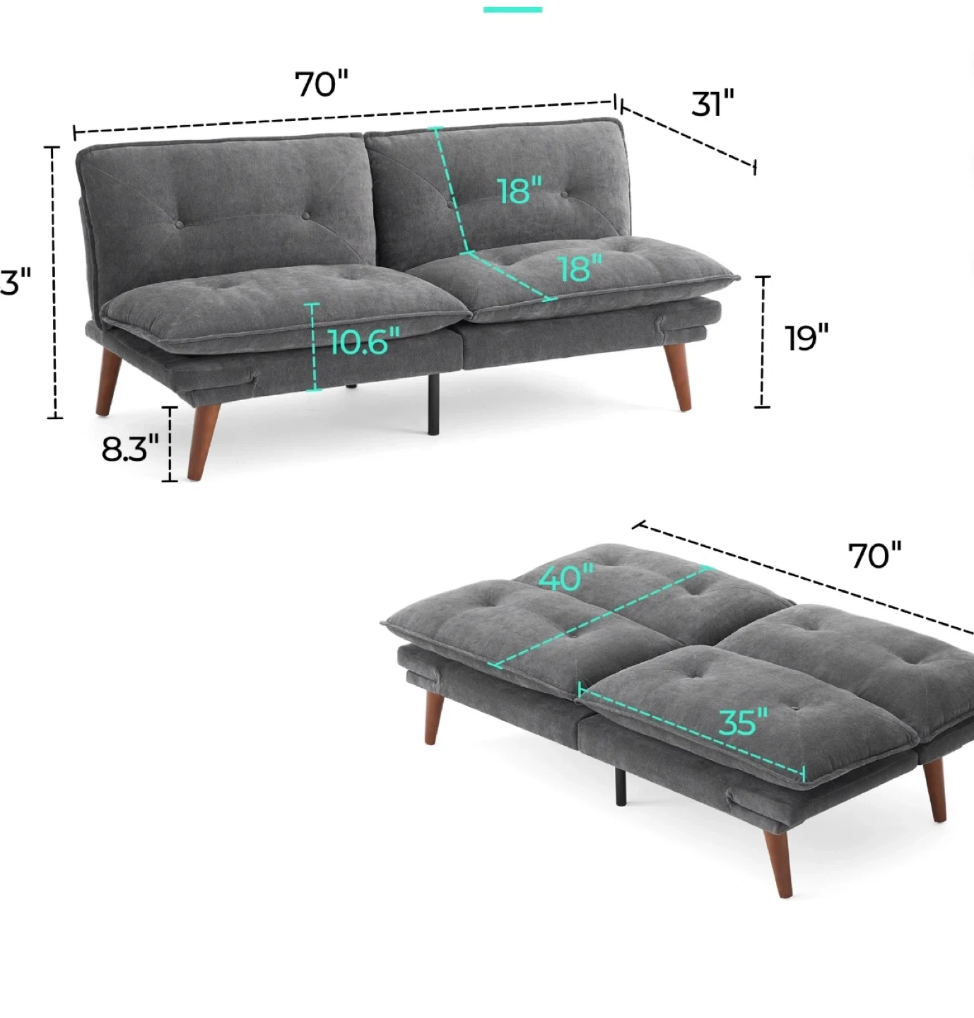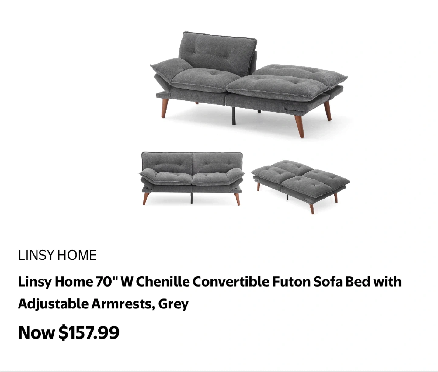 Selling a Linsy Home 70" wide chenille convertible futon sofa bed in grey! It features adjustable armrests and can convert into a sofa, recliner, or sofa bed. Dimensions are approximately 70" x 31" x 33" as a sofa and 70" x 40" as a bed