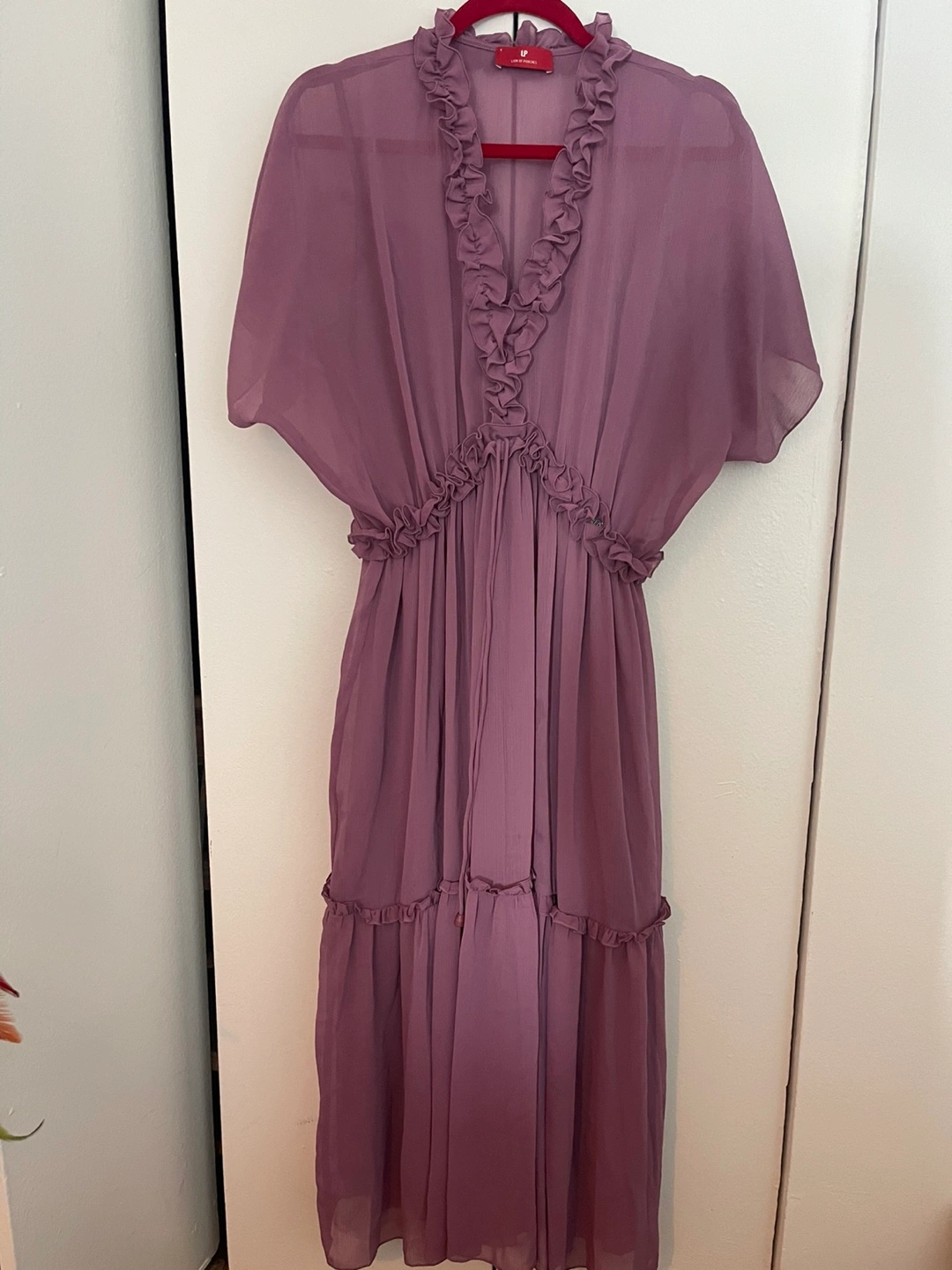 This is a lovely Lion of Porches dress in size S. It features a beautiful design with ruffles and a flowy silhouette. Perfect for a special occasion or a stylish everyday look!