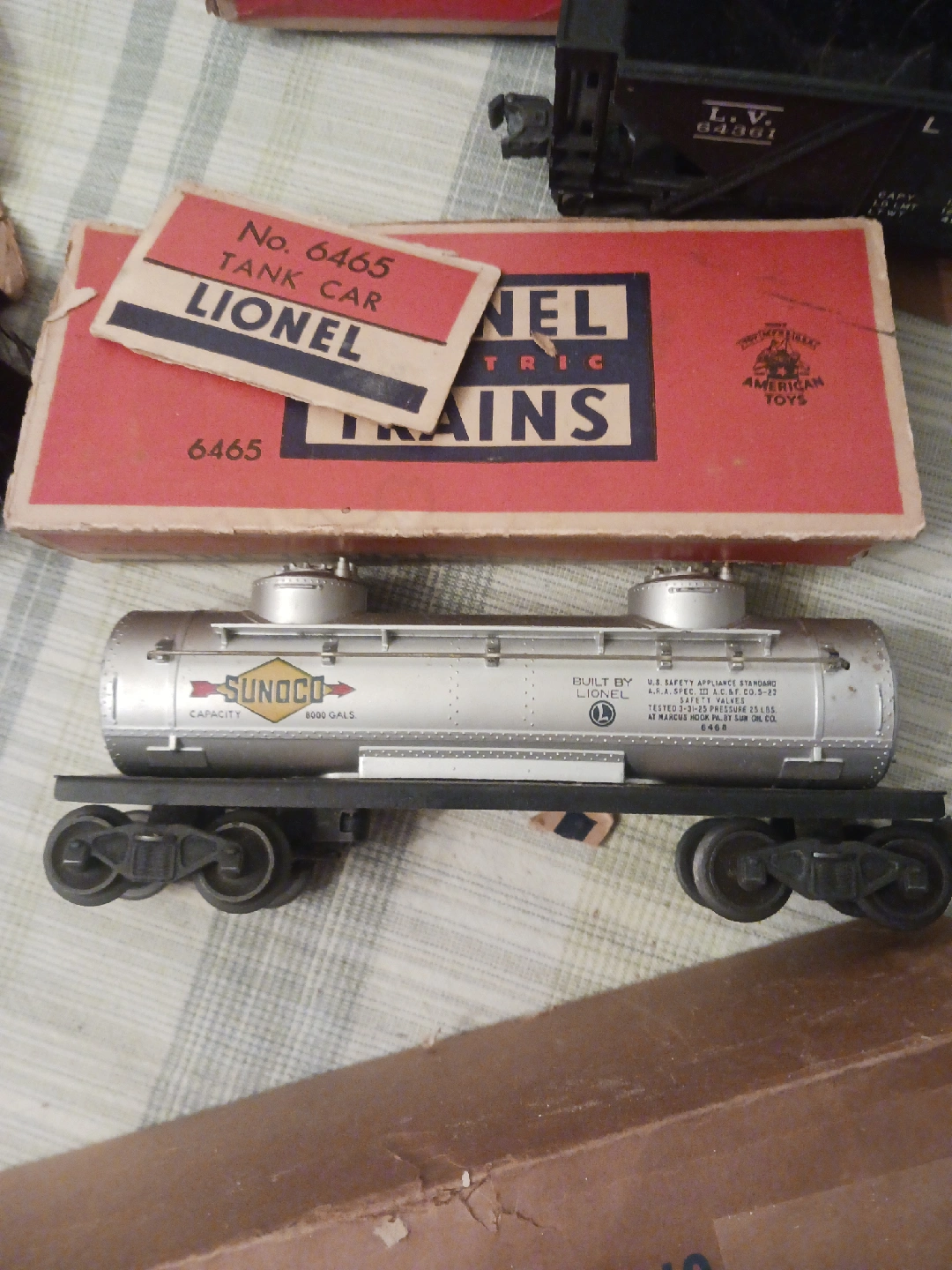 15Selling a Lionel No. 6465 Tank Car! It comes with its original box, adding to its vintage charm. The tank car is a Sunoco model with a capacity of 8000 gallons. A great piece for any Lionel train collector!