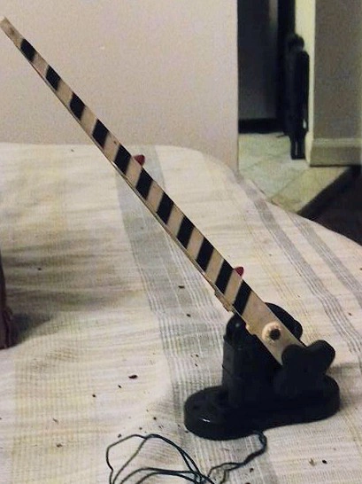 Here is a Lionel train crossing gate. It is black and white with a black base. It is in good condition and will make a great addition to your train set