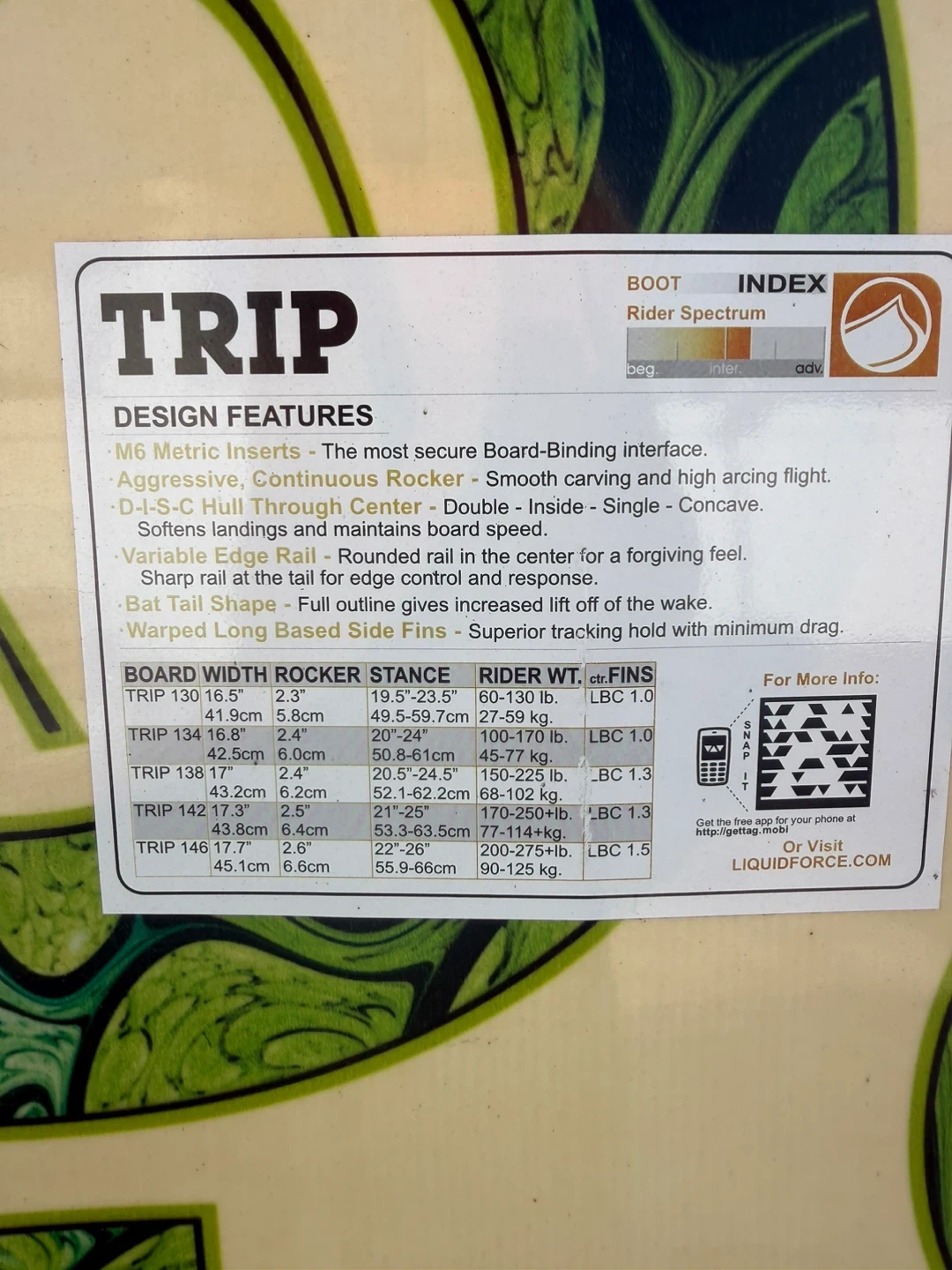 17Selling a Liquid Force Trip wakeboard, size 138. It features aggressive, continuous rocker for smooth carving and high arcing flight. It also has a D-I-S-C hull through the center, which is double-inside-single concave. Board width is 17.3".
