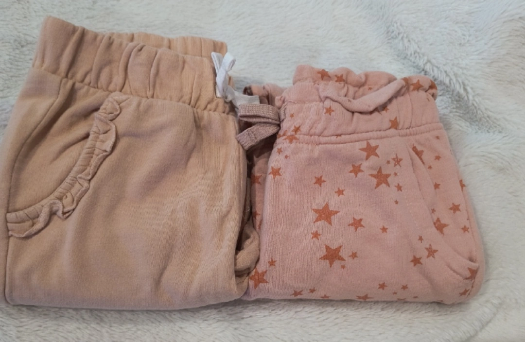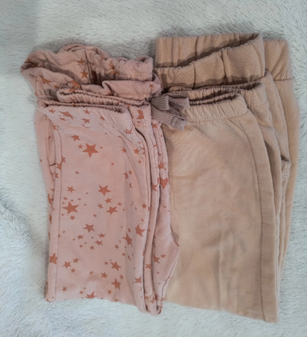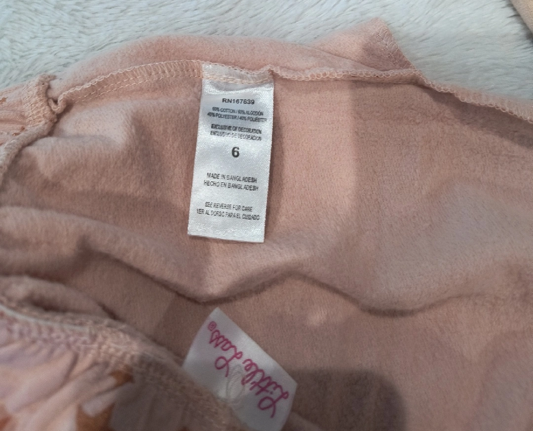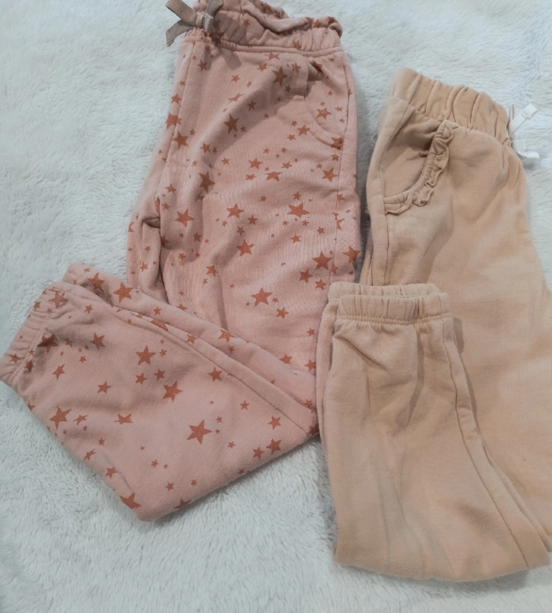 65I'm selling a set of two pairs of pants from Little Lass! One pair is a solid beige color, and the other is a light pink with a star pattern. They are both size 6 and made of 60% cotton and 40% polyester
