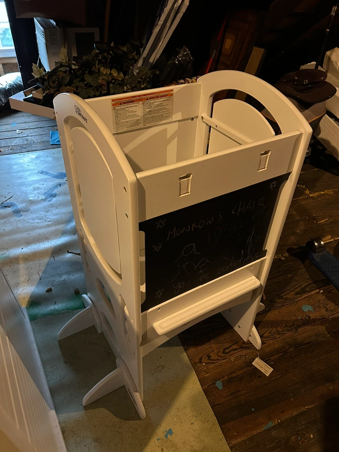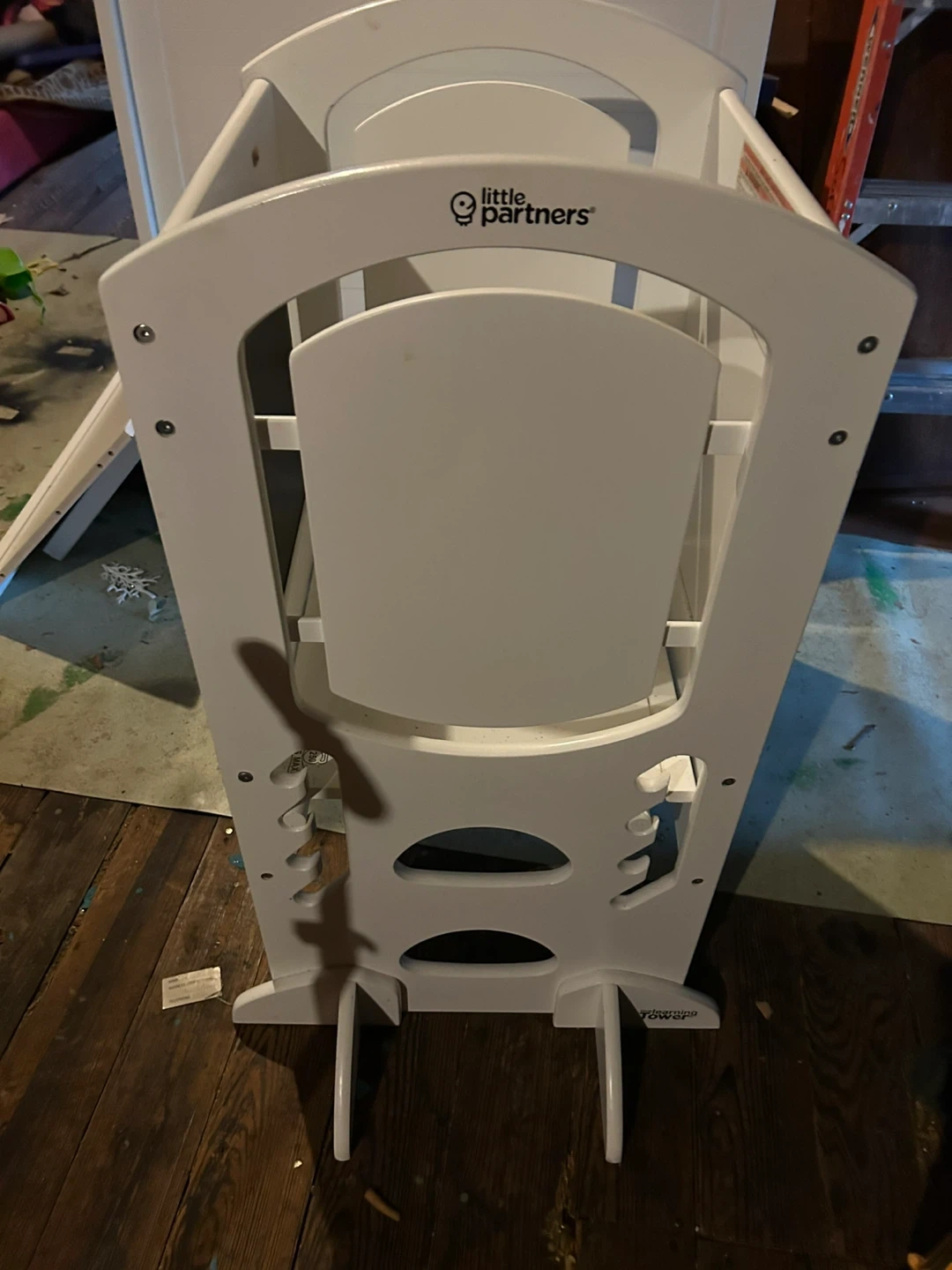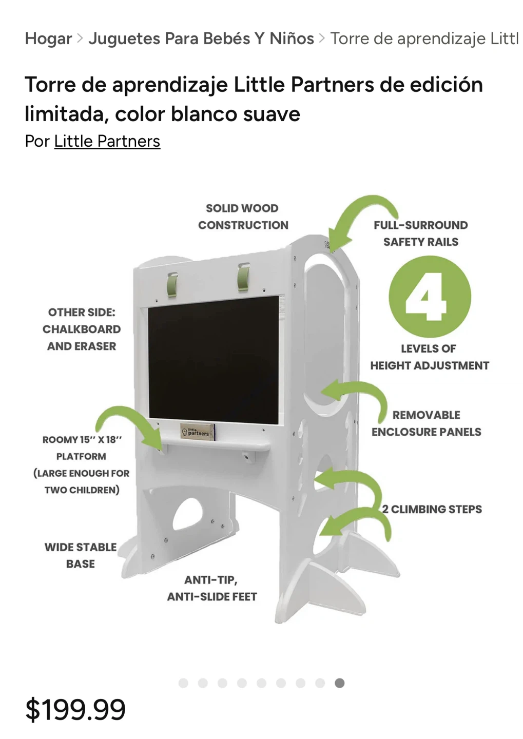 ¡Esta es una torre de aprendizaje de Little Partners en blanco! Cuenta con: - Construcción de madera maciza - Rieles de seguridad envolventes completos - 4 niveles de ajuste de altura - Paneles de carcasa extraíbles - 2 escalones de escalada - Amplia plataforma de 15” x 18” (lo suficientemente grande para dos niños) - Base amplia y estable - Pies anti-inclamiento, antideslizantes ¡Un lado tiene una pizarra y una goma de borrar!