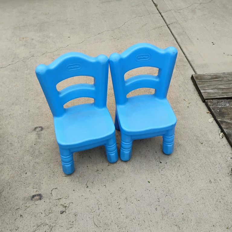 Adorable set of two blue chairs. Made of durable plastic. Suitable for indoor or outdoor use. These chairs can provide the perfect spot for your child to enjoy a peaceful story.