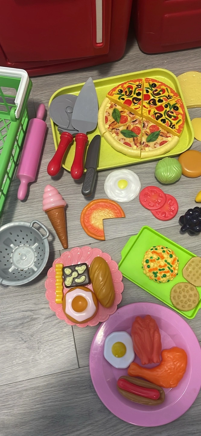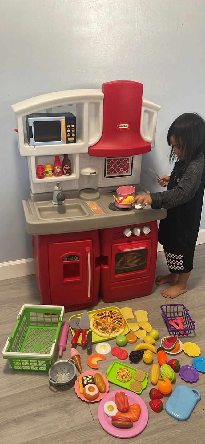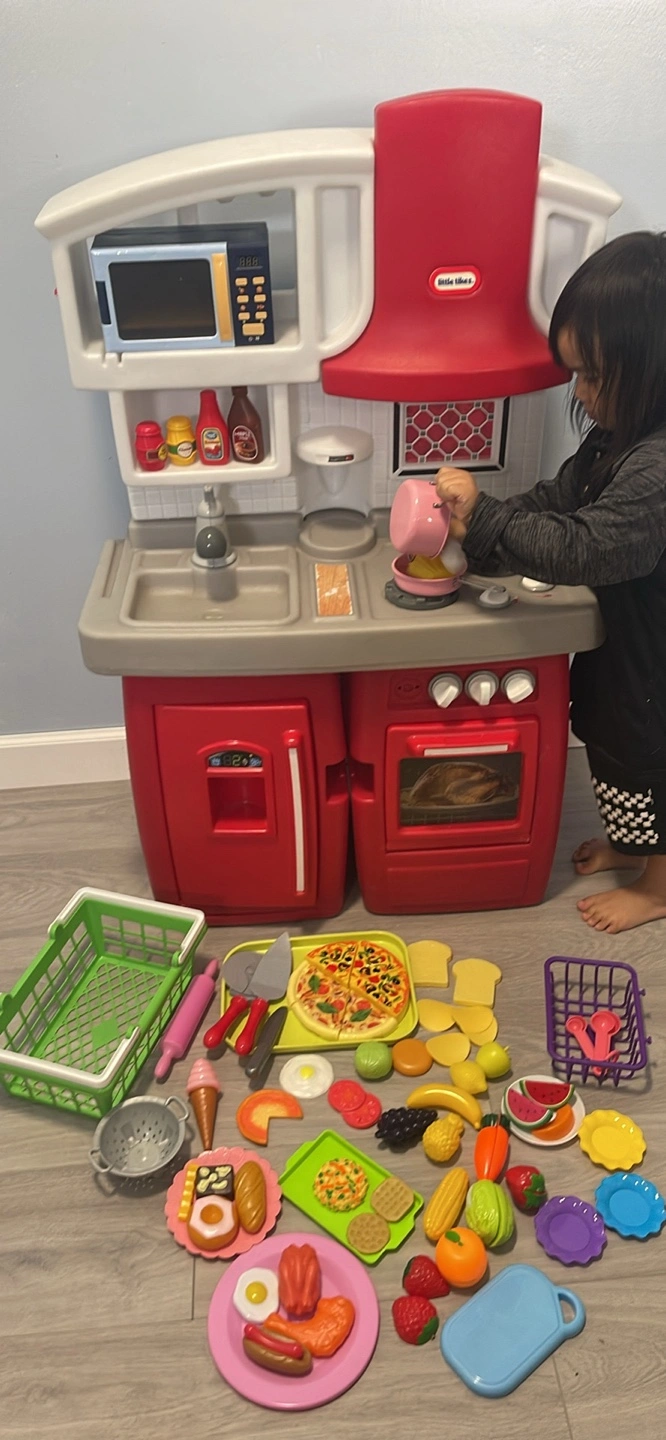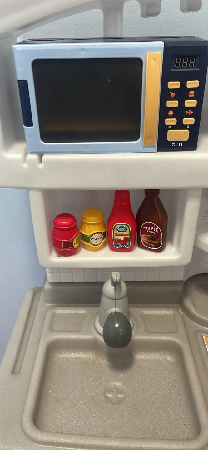 167Play kitchen includes sink, stove, microwave, and many food accessories. Lots of pretend play food pieces. Great for imaginative play.
