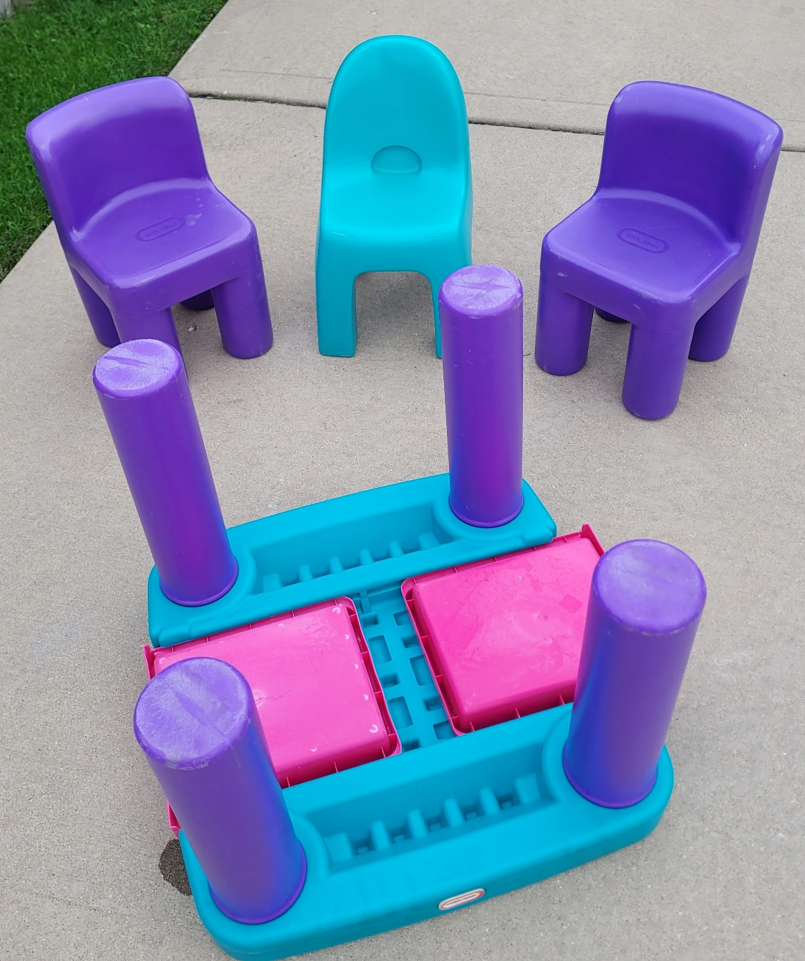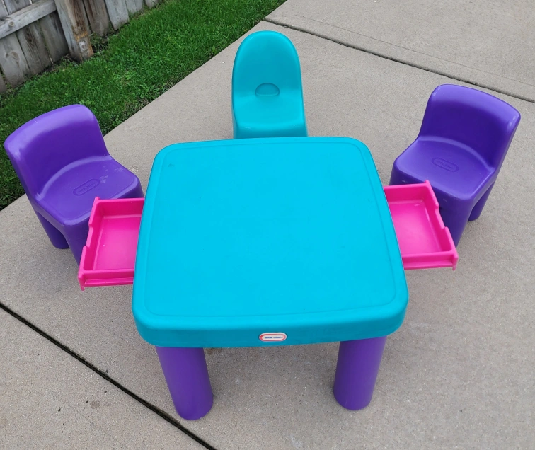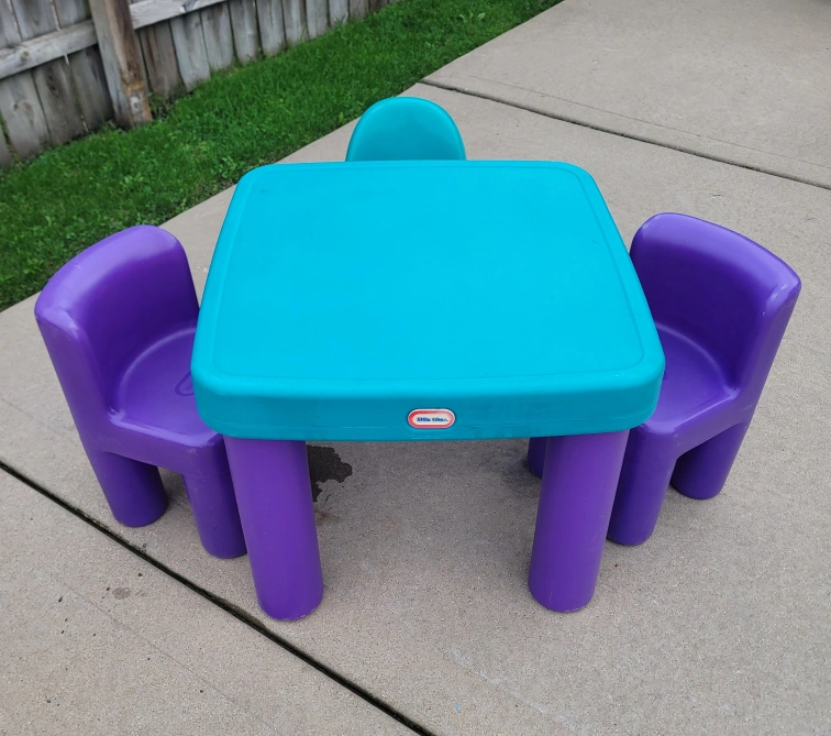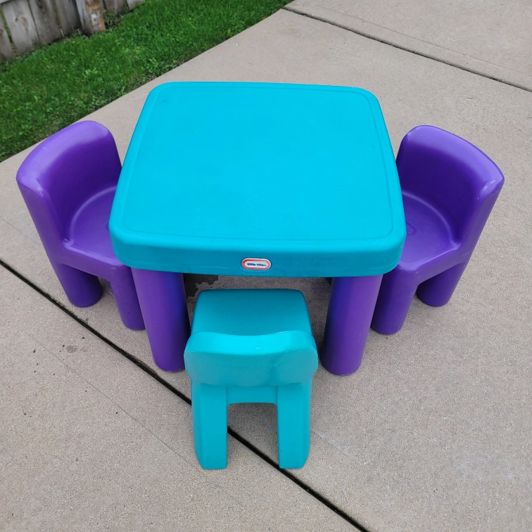 20This is a Little Tikes table and chairs set! The set includes a square table with a turquoise top and purple legs, along with three chairs in purple and turquoise. It's perfect for kids to play, eat, or do crafts. Great for indoor or outdoor use! very clean and well taken care of .
