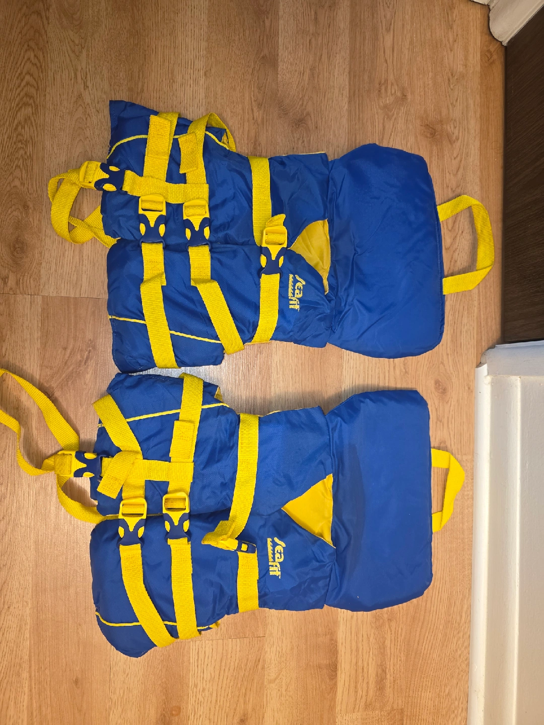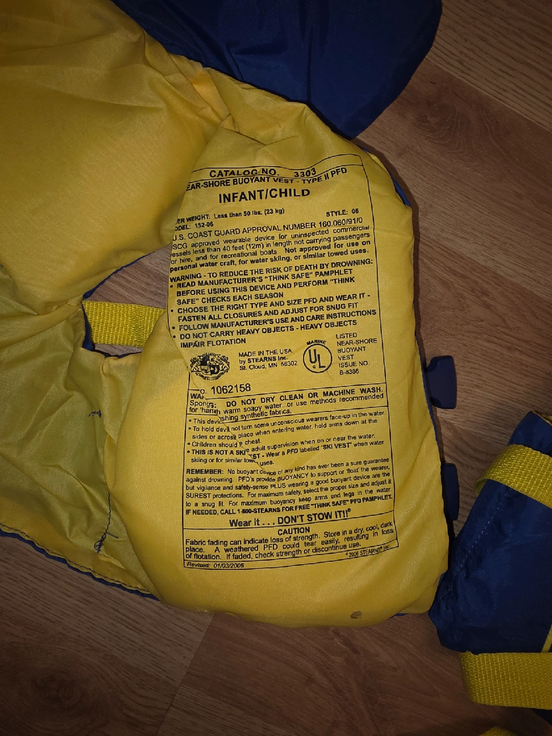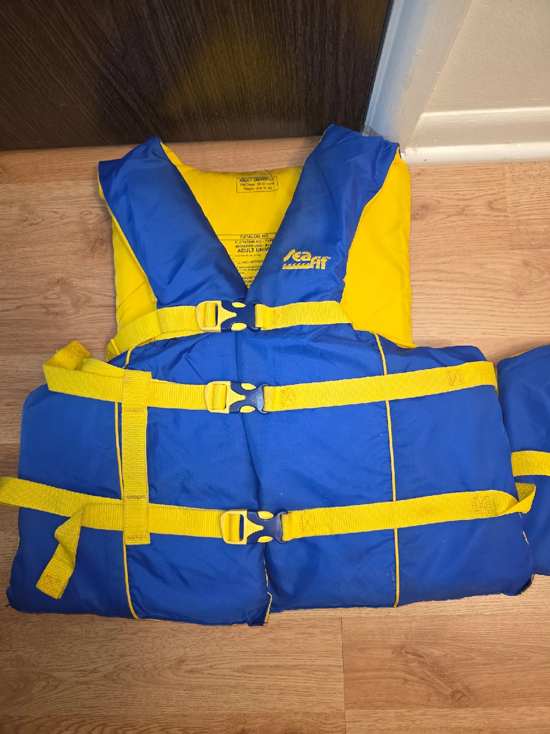 Selling a Stearns I404 Adult Universal life vest in blue and yellow. It's in good condition. 4 Adults & 2 infant come in special bag