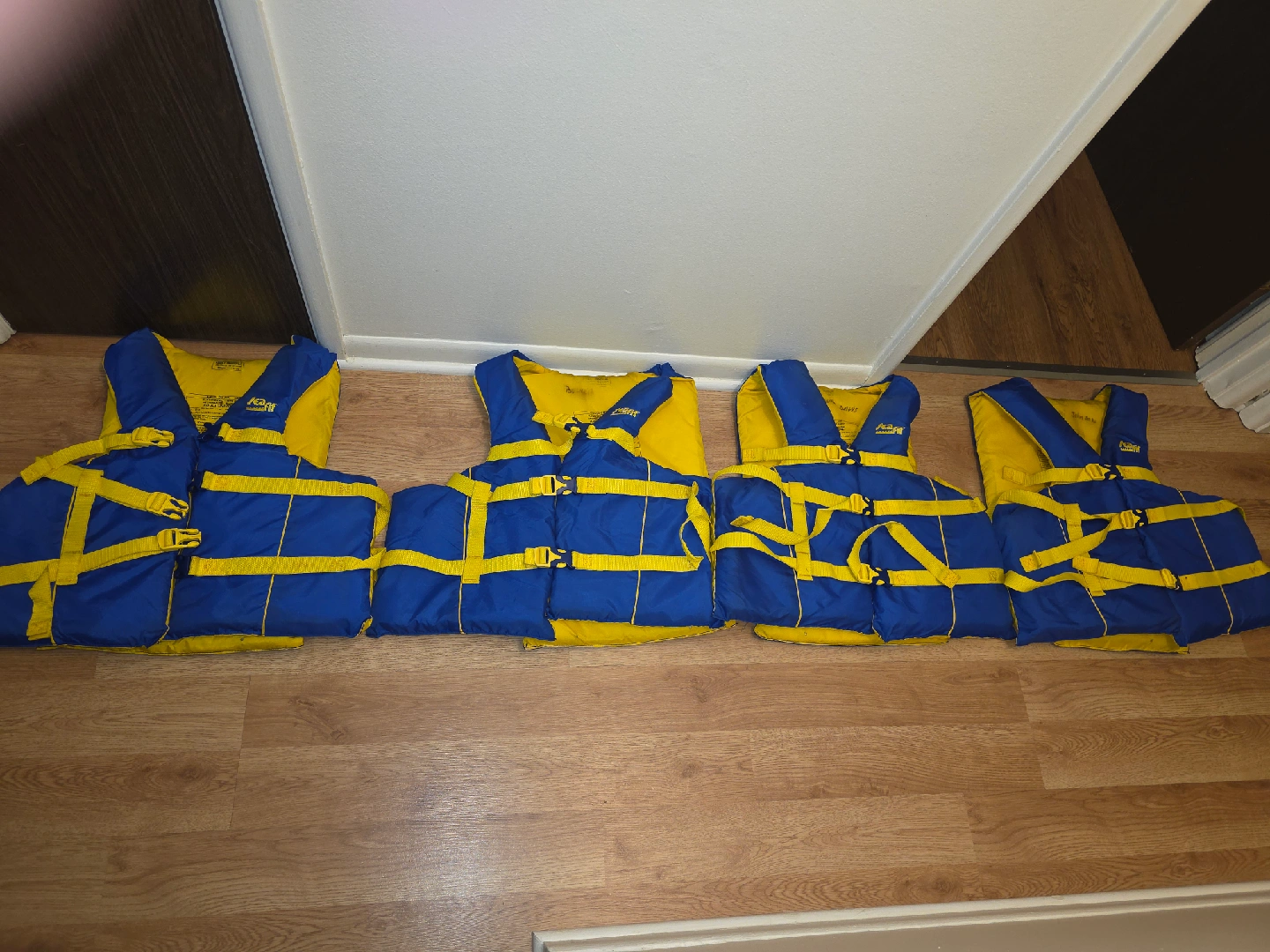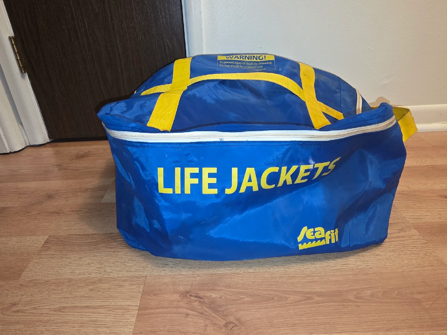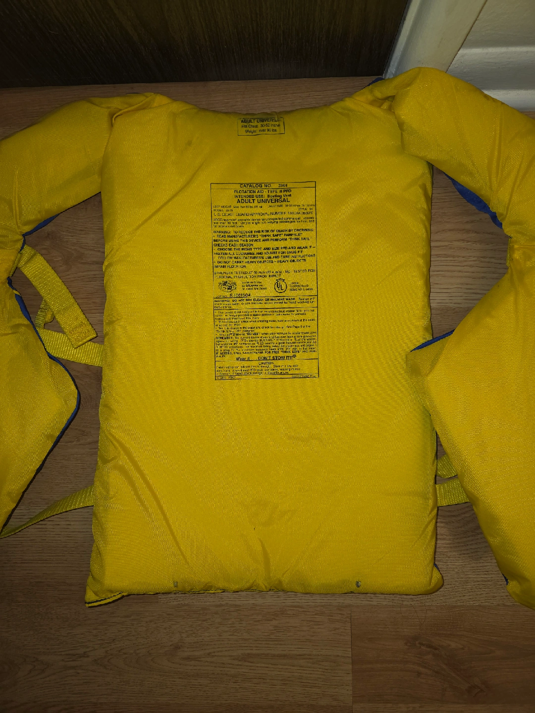Selling a Stearns I404 Adult Universal life vest in blue and yellow. It's in good condition. 4 Adults & 2 infant come in special bag