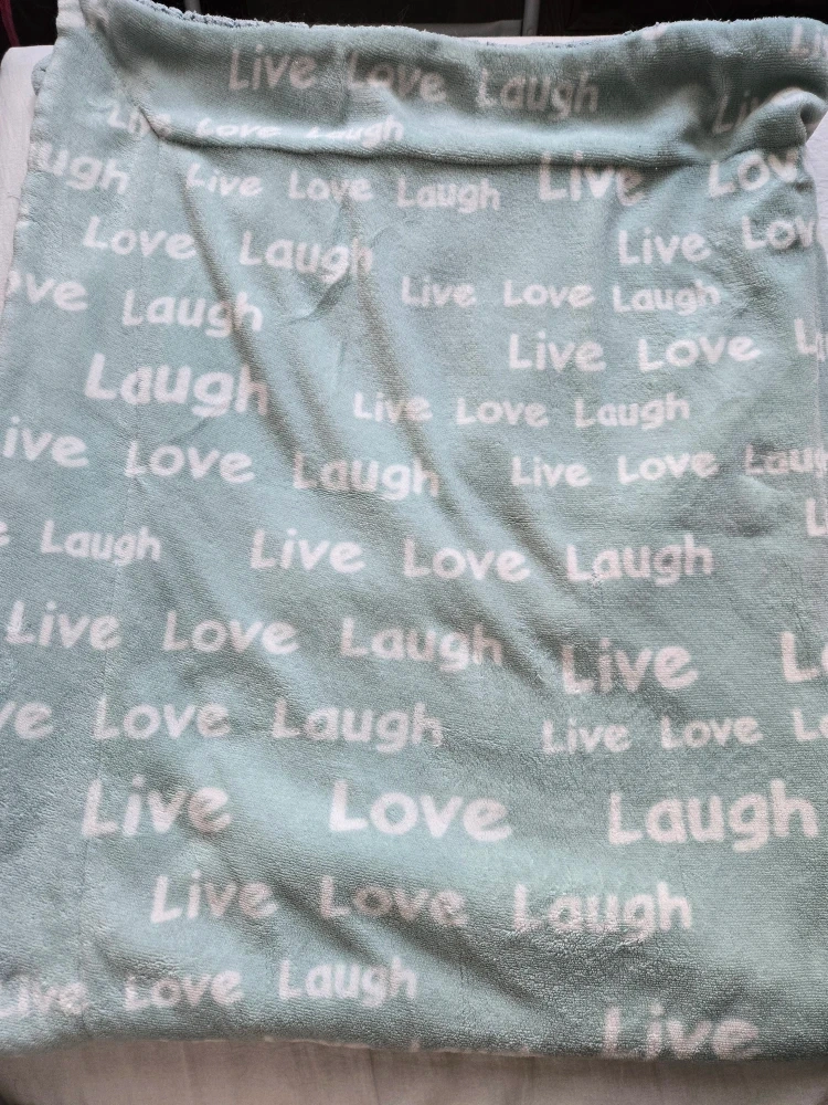 70This is a soft small throw blanket with 'Live Love Laugh' printed all over it! It's light blue.