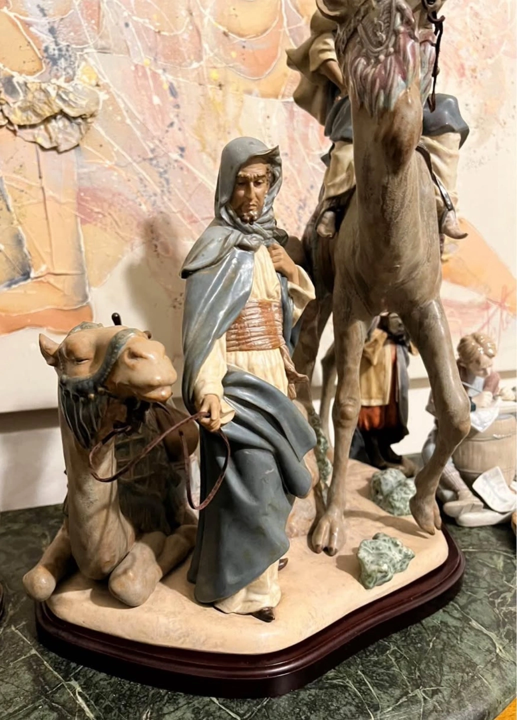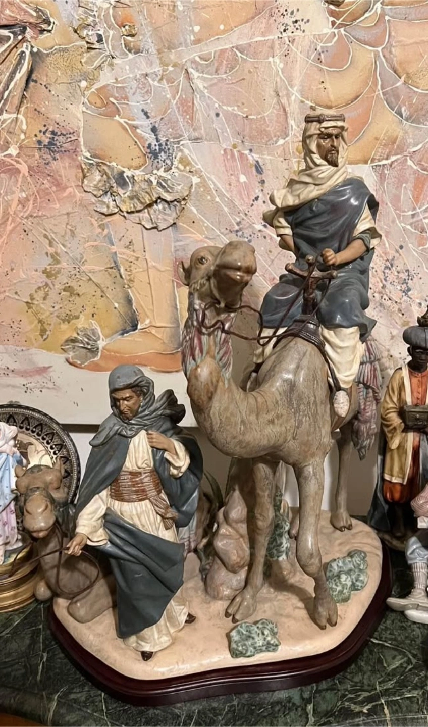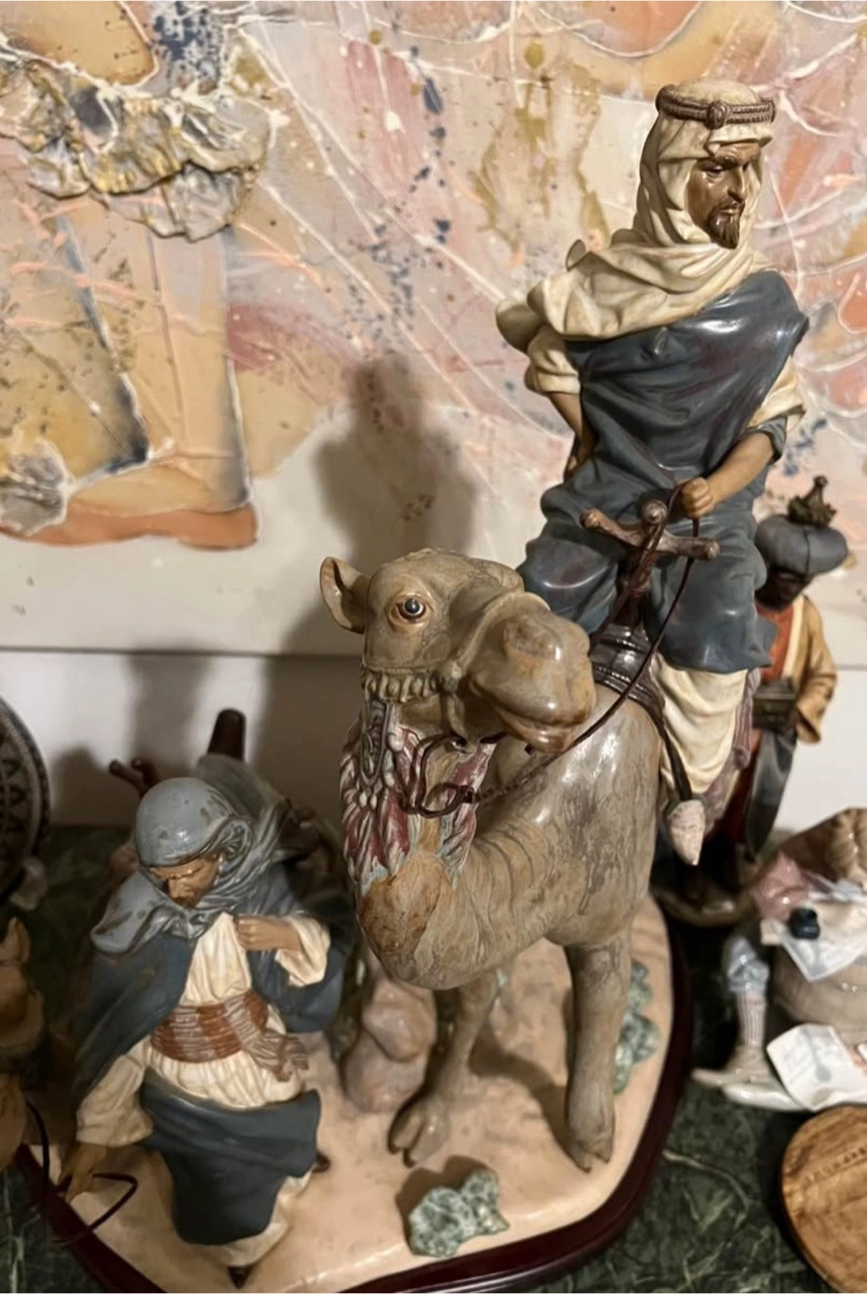 10Features multiple figurines and camels. Includes intricate details like clothing and facial expressions. The base is a dark wooden color. Putting this on display is sure to brighten up any room. Only Cash and Pick Up