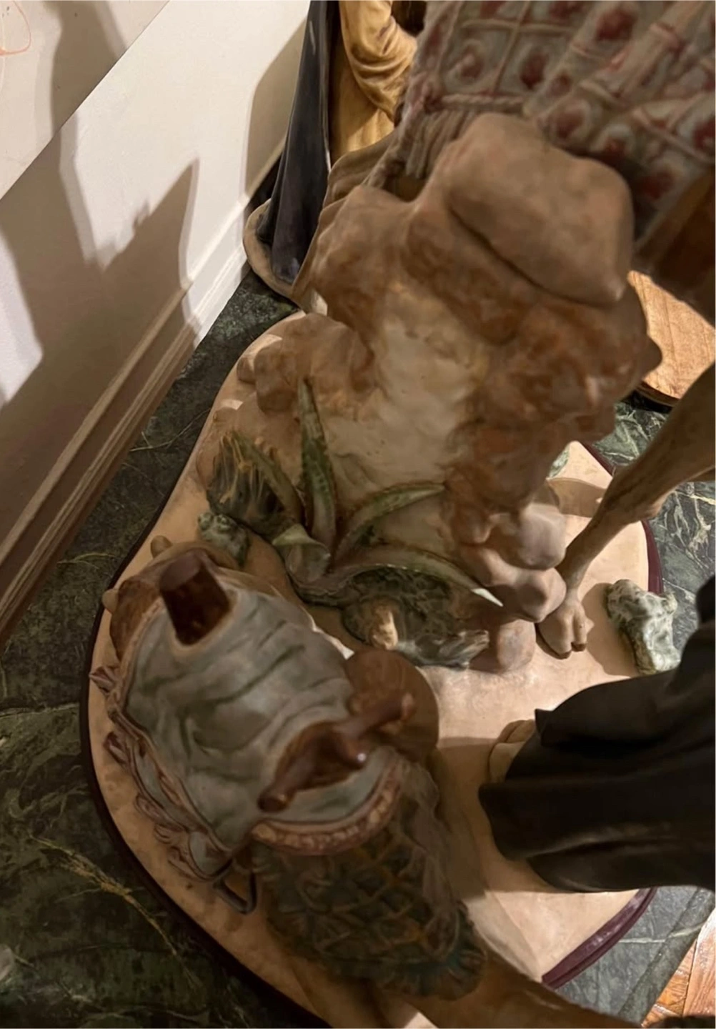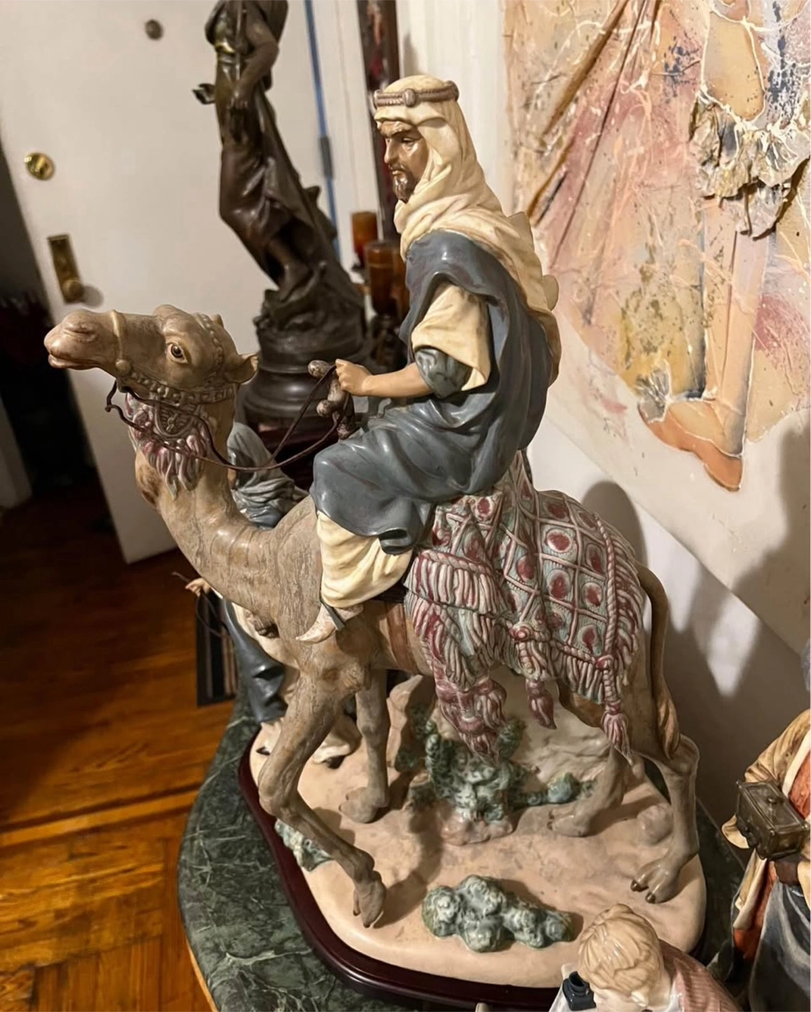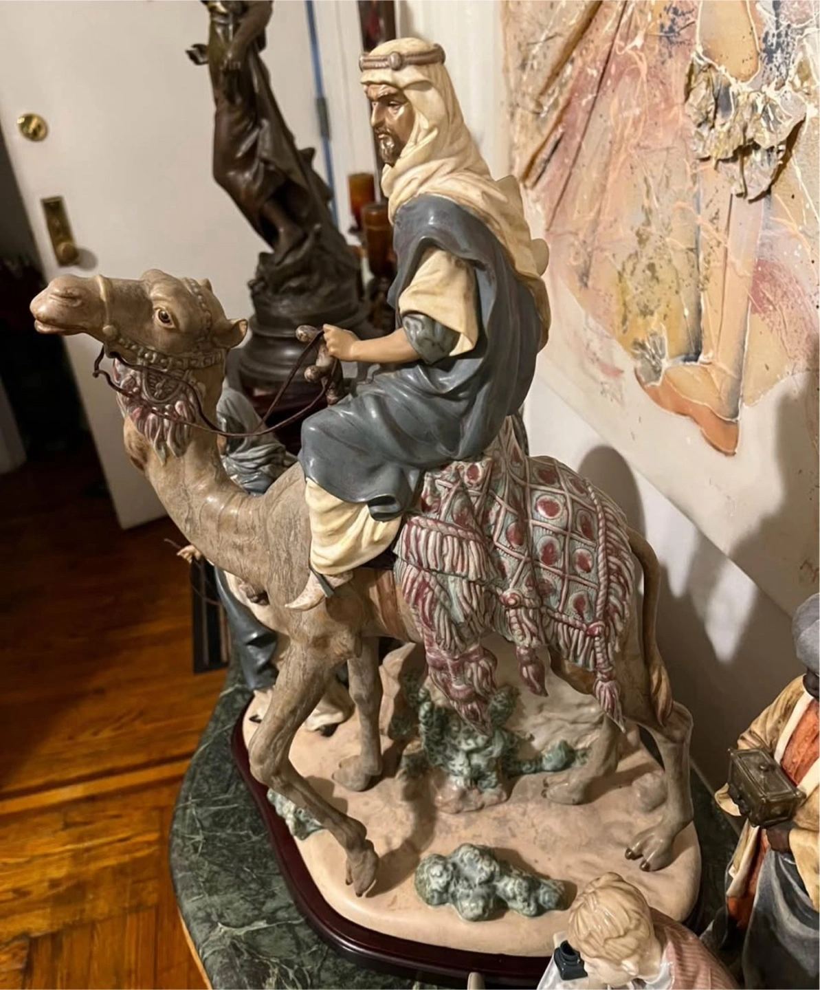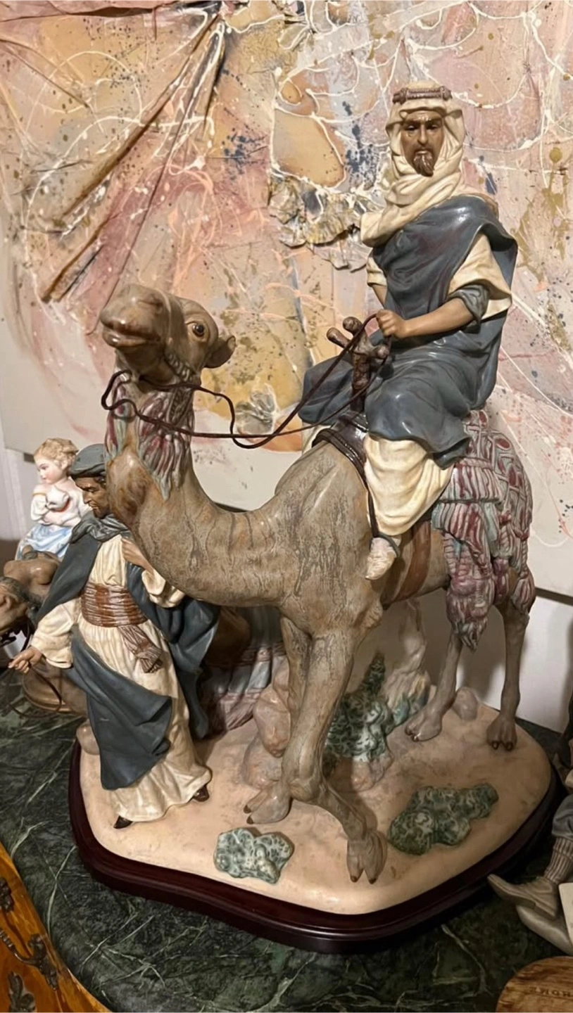 10Features multiple figurines and camels. Includes intricate details like clothing and facial expressions. The base is a dark wooden color. Putting this on display is sure to brighten up any room. Only Cash and Pick Up
