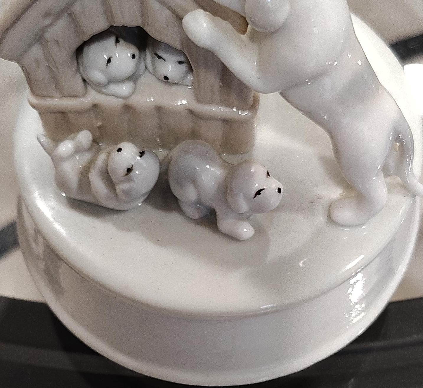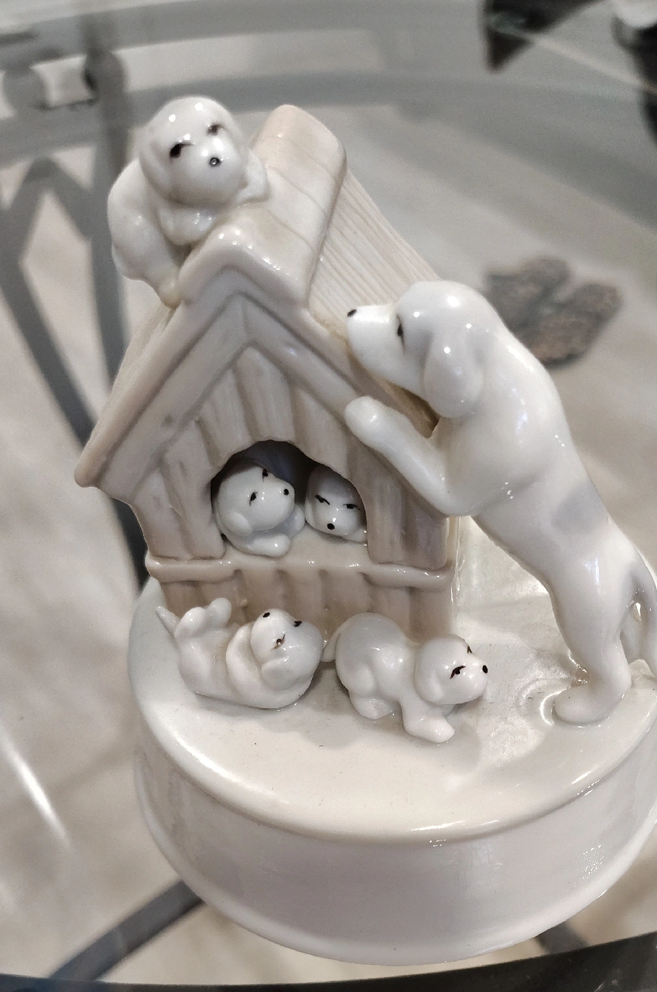 65This is a Lladro figurine featuring puppies playing around a doghouse. It's in great condition and would make a lovely addition to any collection. It also winds up to spin and play a tune great for dog lovers who also like antiques