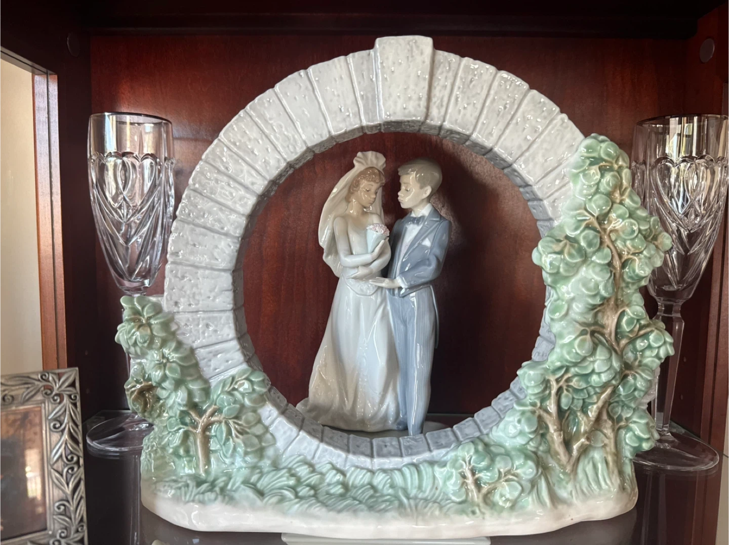 This is a beautiful Lladro figurine depicting a bride and groom standing within an archway. It's in great condition and would make a lovely addition to any collection or a thoughtful wedding gift