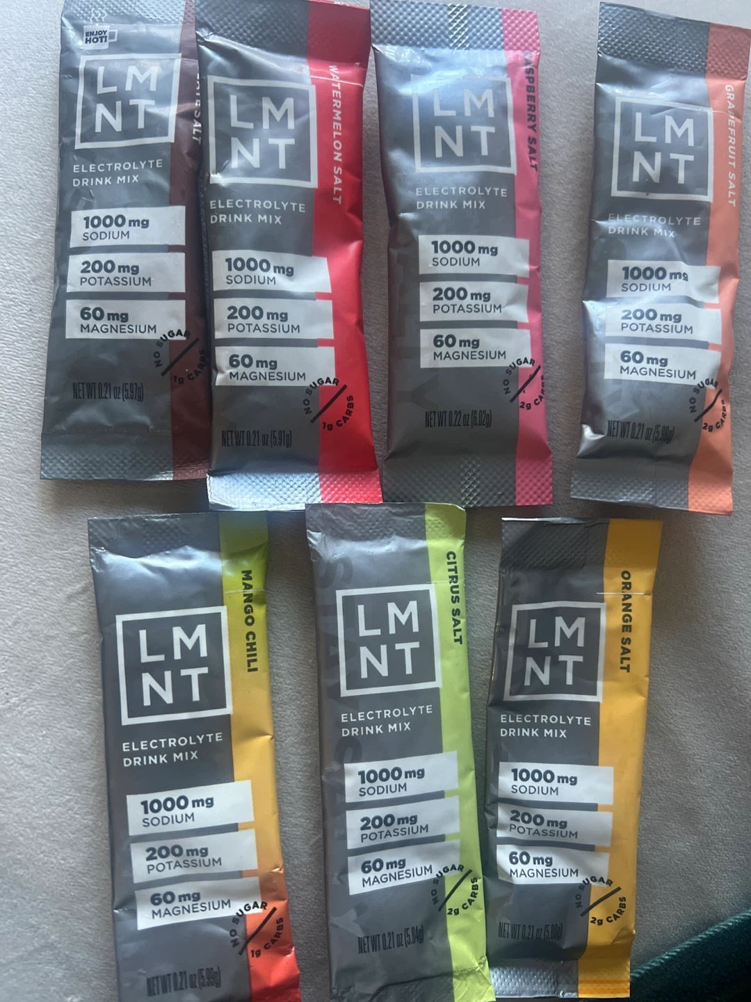 77Brand new variety pack LMNT Electrolyte Drink Mix. Each packet contains 1000mg Sodium, 200mg Potassium, and 60mg Magnesium. Perfect for staying hydrated and replenishing electrolytes. Flavors include Watermelon Salt, Raspberry Salt, Grapefruit Salt, Mango Chili, Citrus Salt, and Orange Salt. Take all 12 for $25 or $2.50 each.
