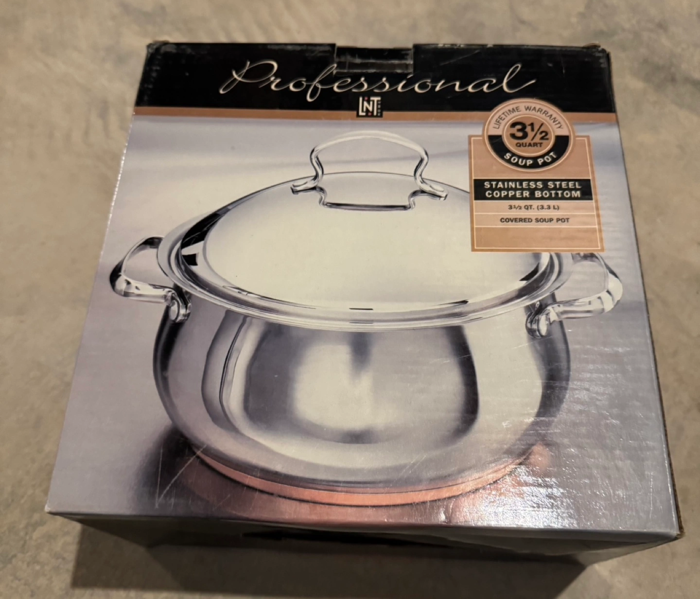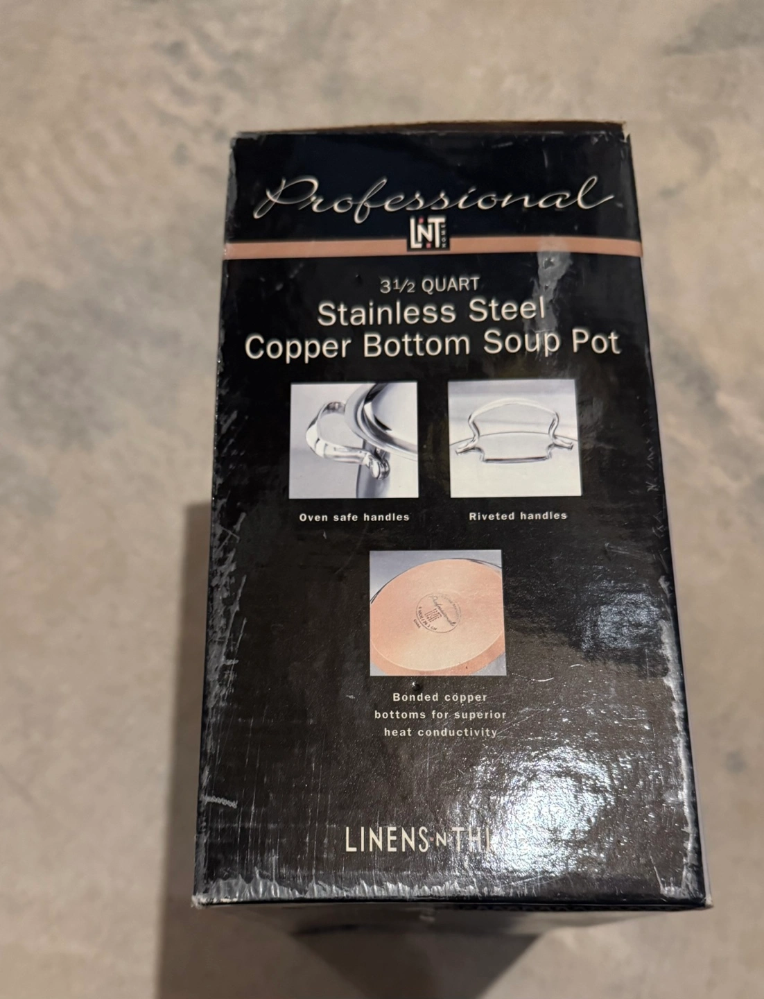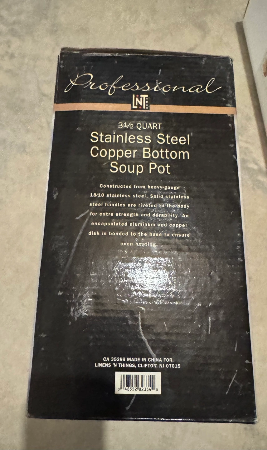 3 1/2 quart covered soup pot. Stainless steel copper bottom. Oven safe handles. Riveted handles. Lifetime warranty. Made in China for Linen N Things. Never been opened or used
