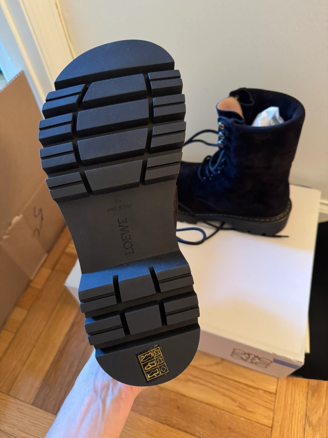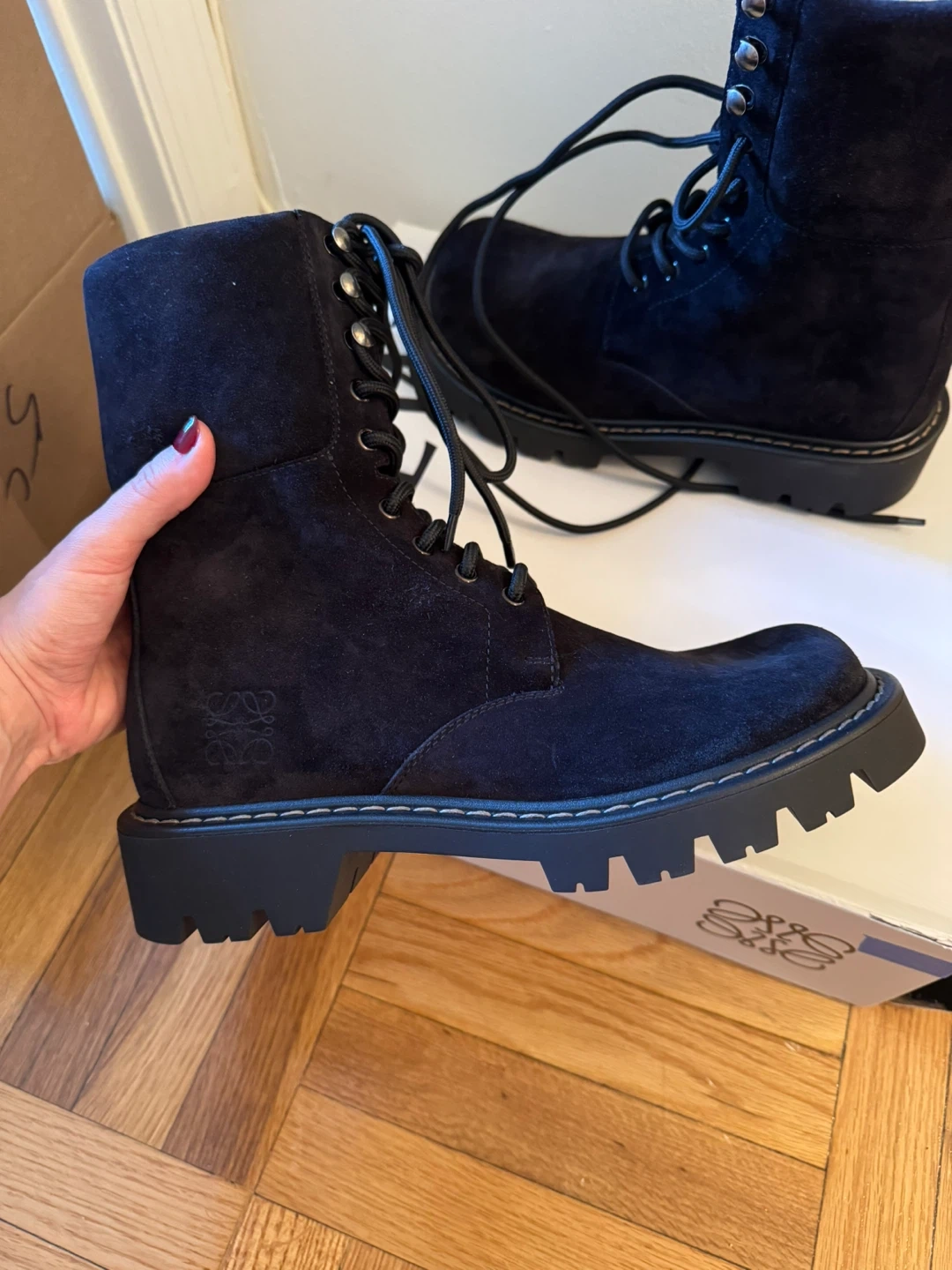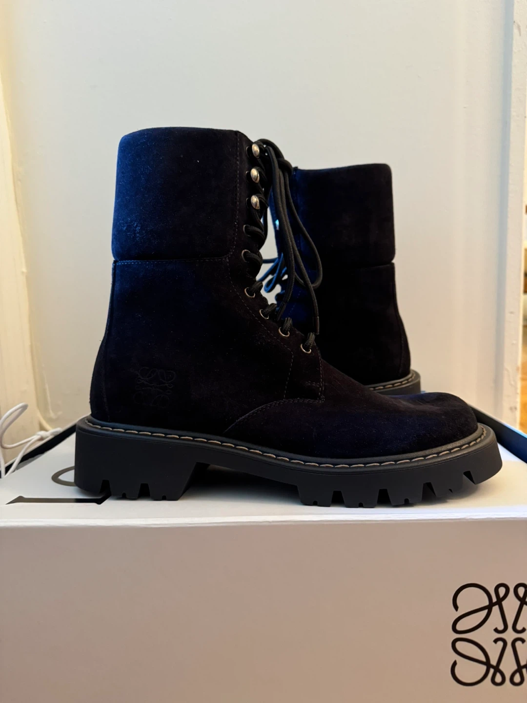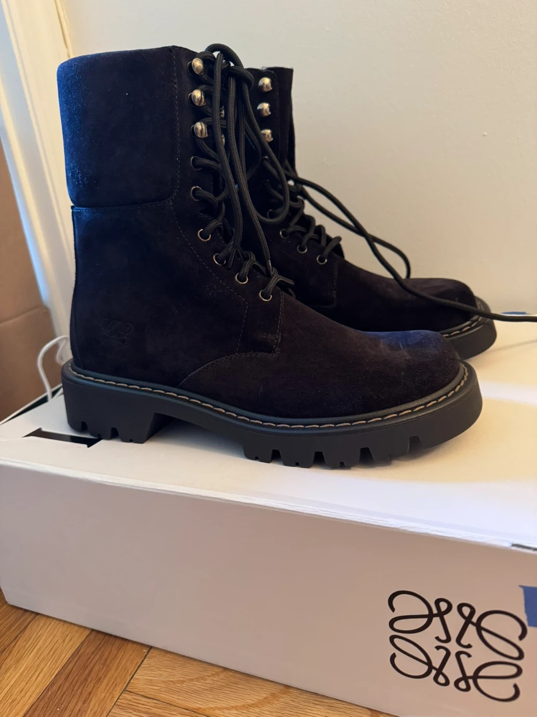 Chic black suede combat boots by Loewe. Features a sturdy lace-up design. Perfect for edgy style. Never used before. Size 10/ European 40