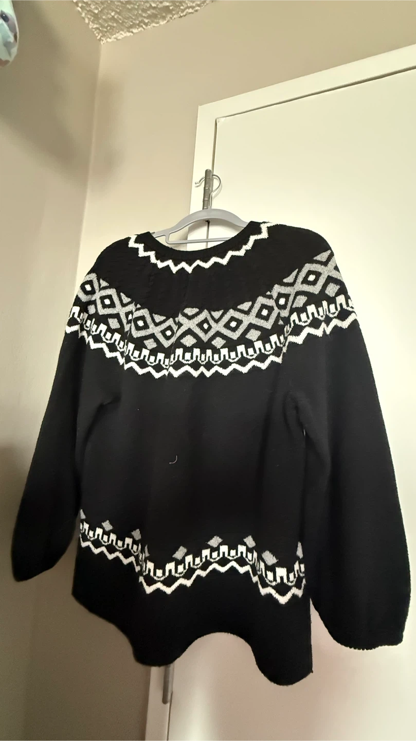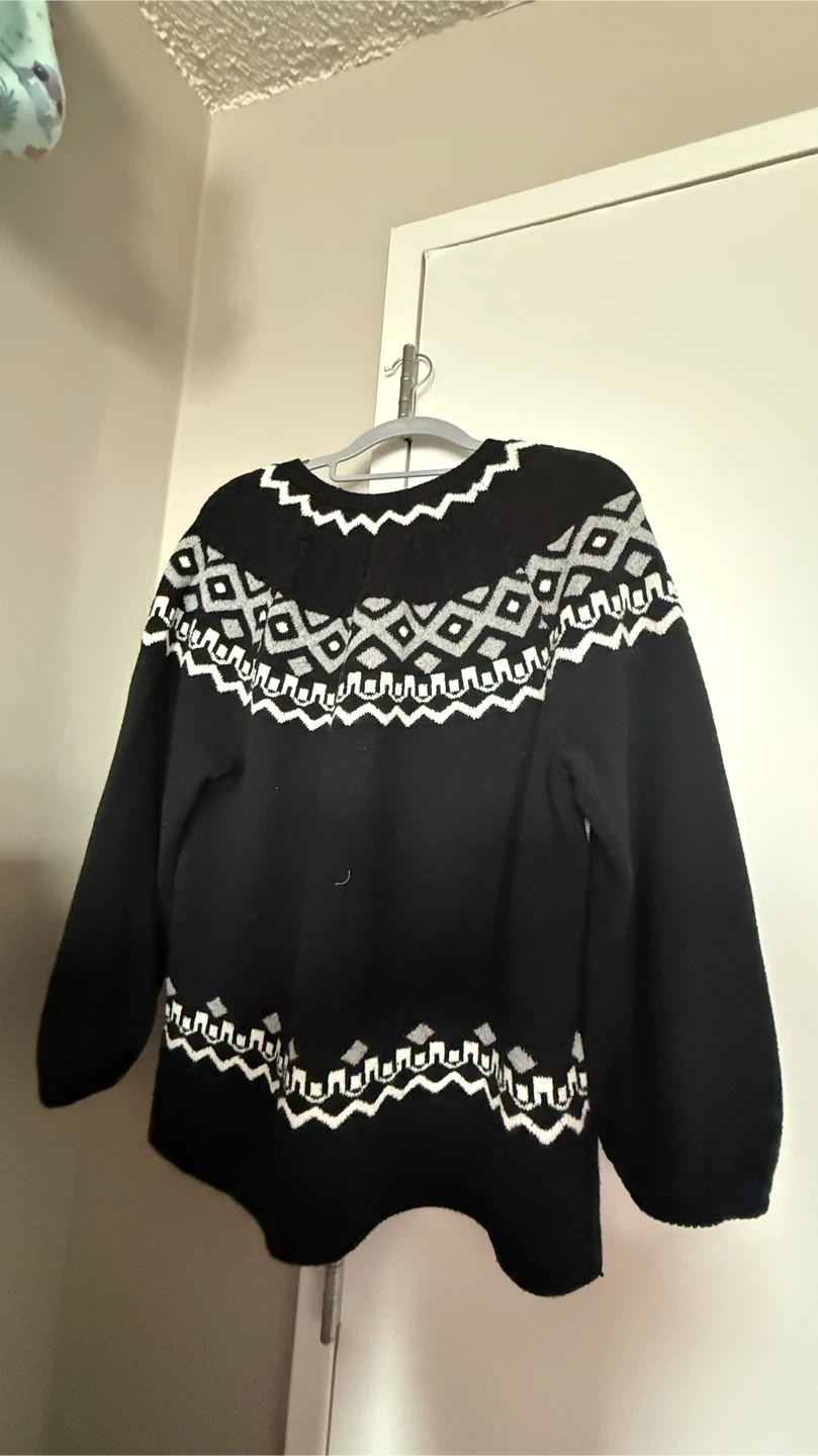 60Selling a LOFT sweater in size large. It features a black background with a geometric pattern, perfect for staying cozy and stylish!